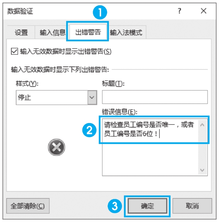 STEP 3: 单击【出错警告】选项卡,在【错误信息】文本框中输入“请检查员工编号是否唯一,或者员工编号是否6位!”,然后单击【确定】按钮,见图1-14。
