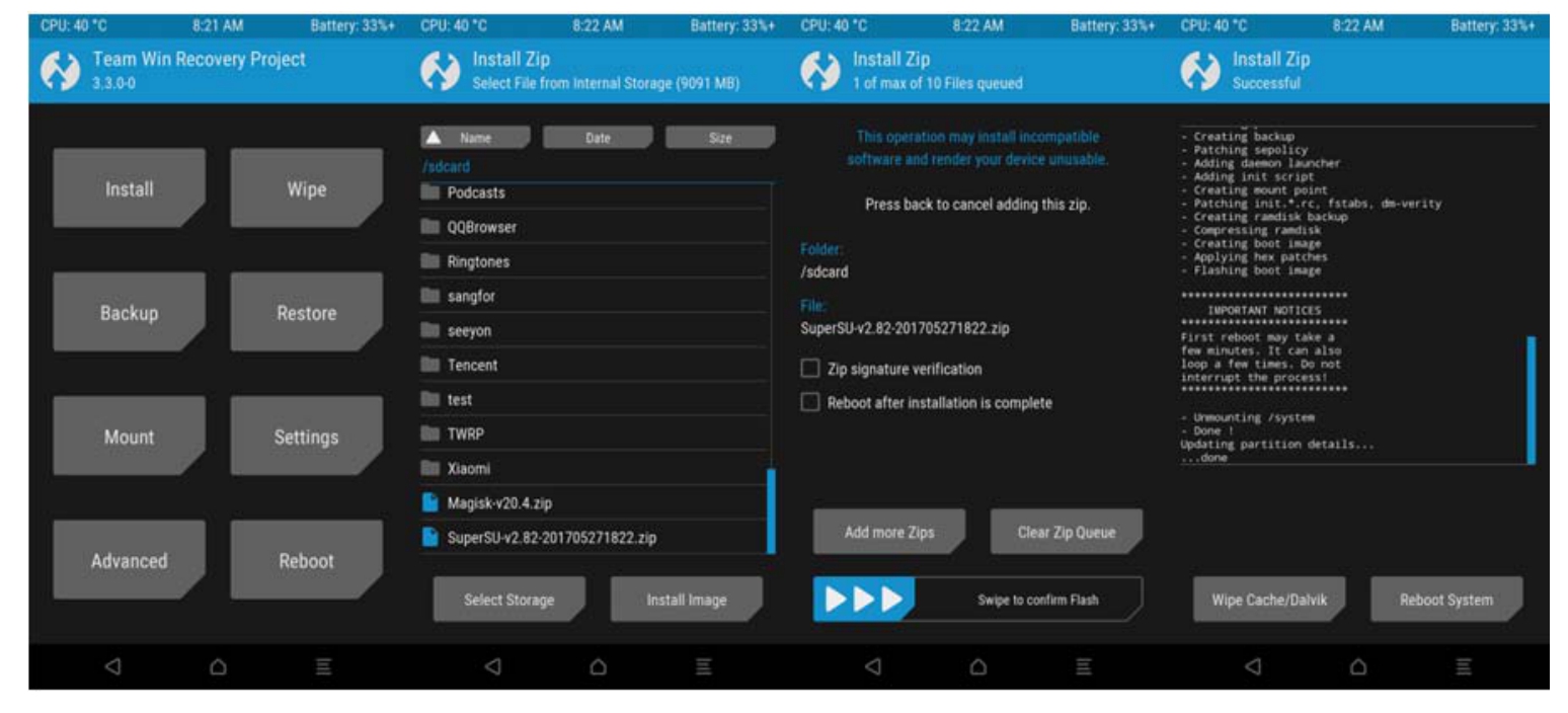 下载完毕后,开始安装环境。在刷入Kali NetHunter之前,要对手机进行Root操作。由于Magisk进行Root的方式实际上是一个“假”Root(读者有兴趣的话可自行研究),因此笔者选择SuperSU进行Root。在安装SuperSU之前,Magisk和SuperSU是不兼容的,首先按照1.3.1小节中的步骤重新刷入一个新的镜像。