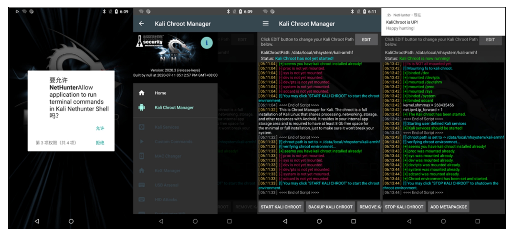 要使用其他NetHunter相关的App,比如图1-21展示的NetHunter终端,则需要打开NetHunter App并允许所有申请的权限。在App进入主界面后,打开App侧边栏,选择Kali Chroot Manager就会自动安装上Kali Chroot。在安装完毕后,单击START KALI CHROOT启动Chroot,就可以使用NetHunter-Terminal和NetHunter-Kex了,详细步骤如图1-22所示。