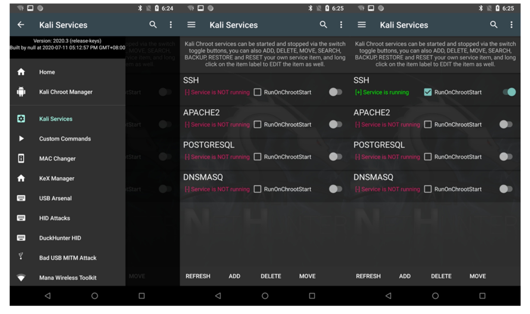 此时,可以通过手机上的NetHunter终端运行各种Android原本不支持的Linux命令。如果觉得手机界面过小,还可以通过SSH连接手机最终在计算机上操作手机。具体关于SSH的配置,可以打开NetHunter,在侧边栏中选择Kali Services,然后勾选RunOnChrootStart,并选中SSH按钮,具体操作流程如图1-23所示。这时,如果计算机和手机在同一个内网中,则可以使用计算机上的终端进行SSH连接。