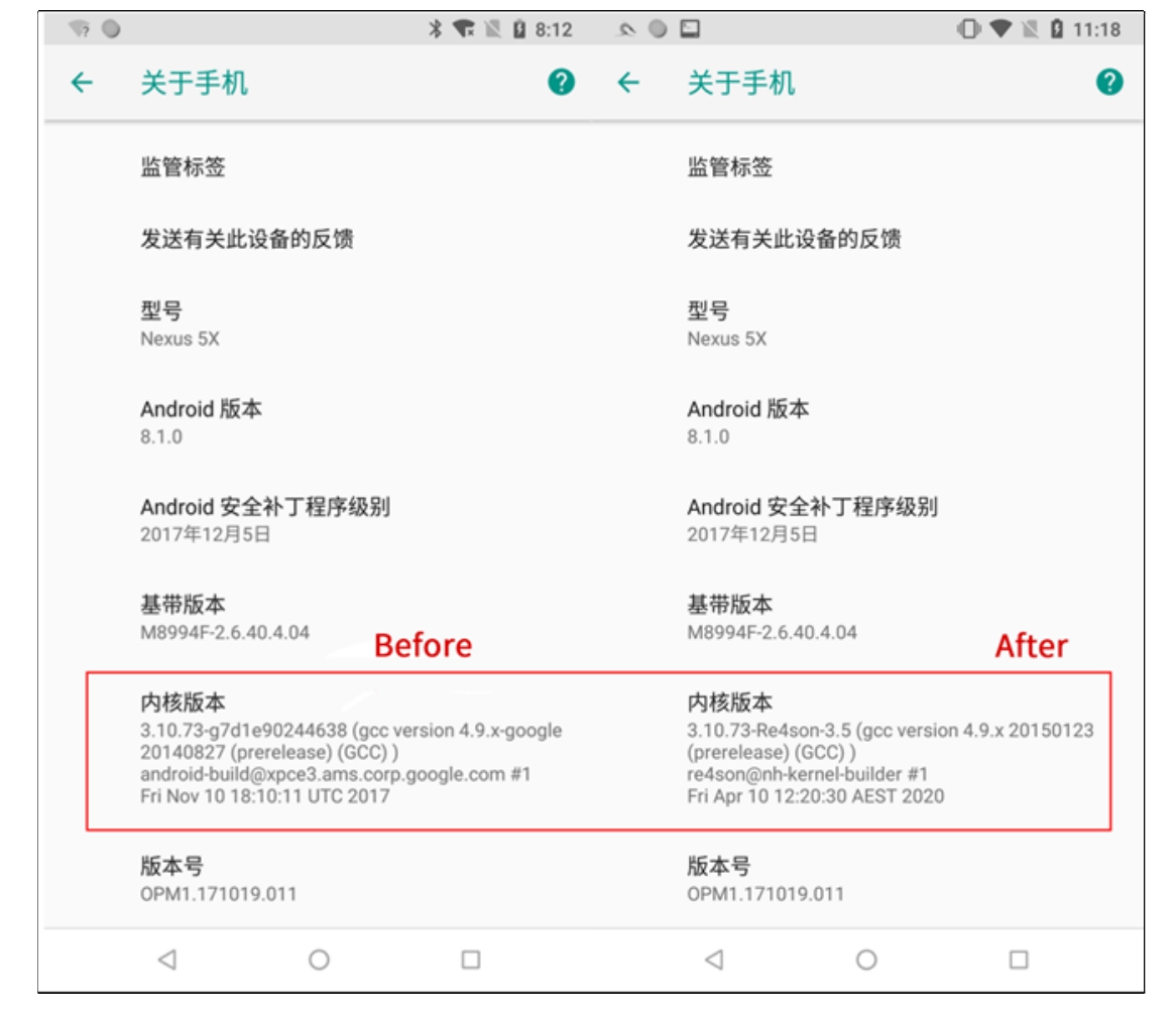 图1-20 Kali NetHunter刷之前和刷之后的内核对比