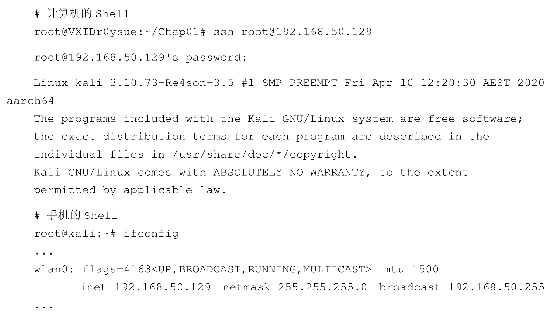 在启动SSH后,在计算机上就可以通过手机的IP来连接手机。笔者手机的IP为192.168.50.129,使用计算机连接手机的演示如下: