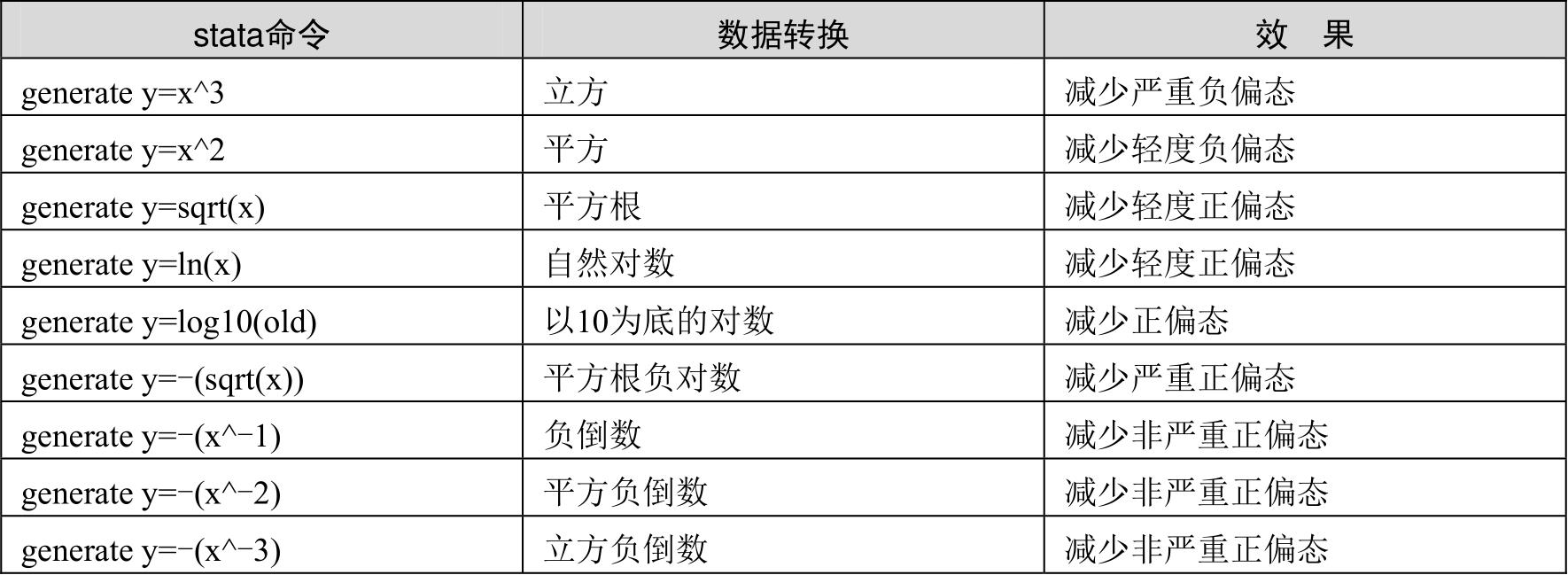 我们在进行数据分析时,在对初始数据进行正态性检验后,可以利用3.1节的相关知识得到关于数据偏度和峰度的信息,我们完全可以根据数据信息的偏态特征进行有针对性的数据变换。数据变换与其对应的Stata命令以及达到的效果如表3.4所示。