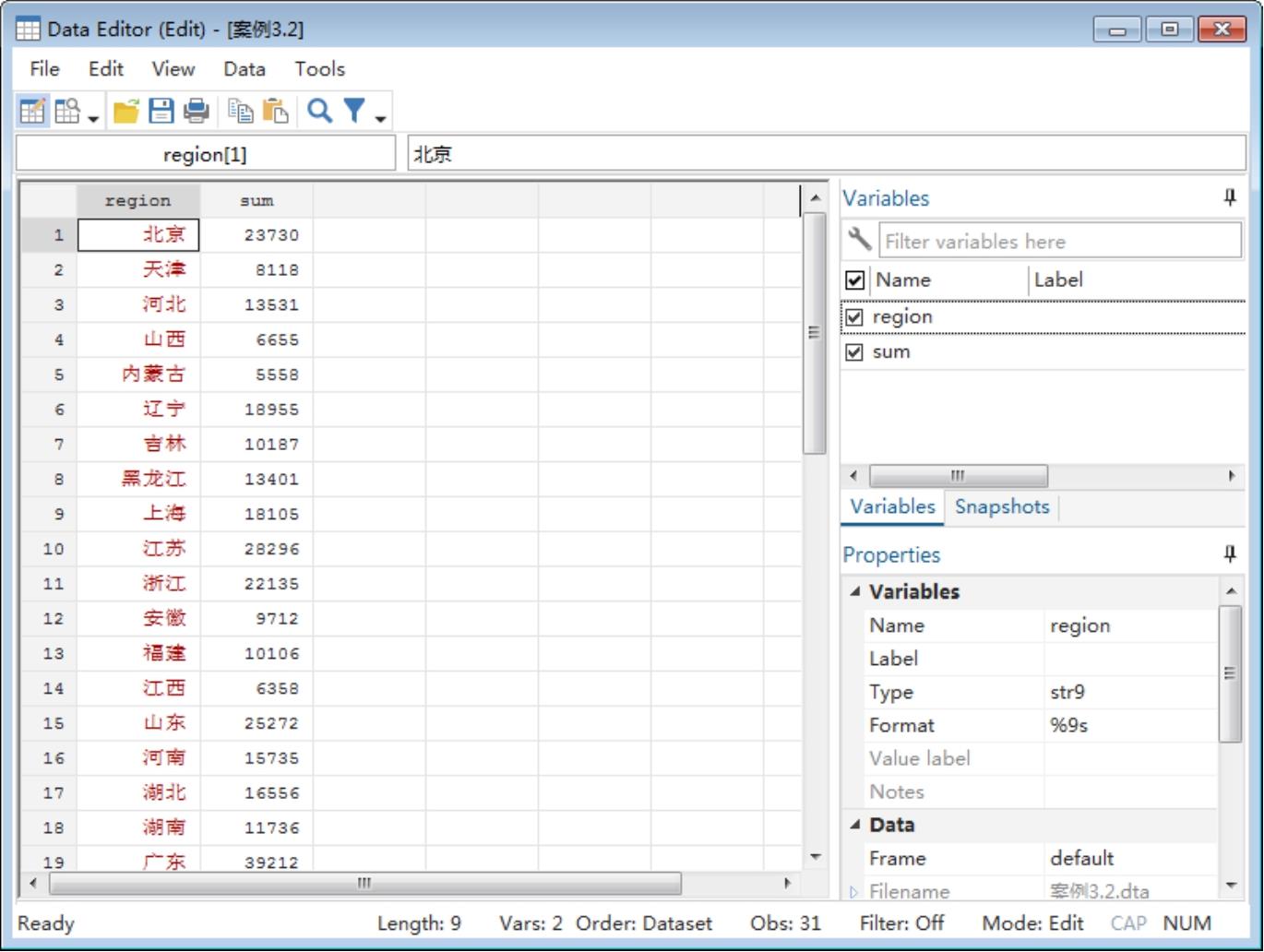 在用Stata进行分析之前,我们要把数据录入Stata中。本例中有两个变量,分别是地区和公共交通车辆运营数。我们把地区变量设定为region,把公共交通车辆运营数设定为sum,变量类型及长度采取系统默认方式,然后录入相关数据。相关操作在第1章中已详细讲述过了。录入完成后数据如图3.7所示。