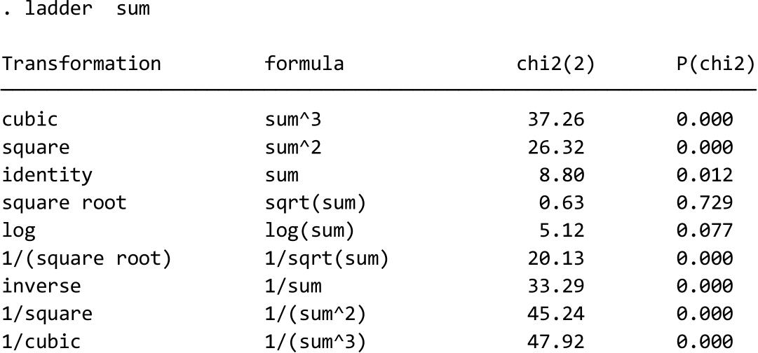 此处我们介绍一个非常好用的命令:ladder。它把幂阶梯和正态分布检验有效地结合到了一起。它尝试幂阶梯上的每一种幂并逐个反馈结果是否显著地为正态或者非正态。以本例为例,操作命令如下: