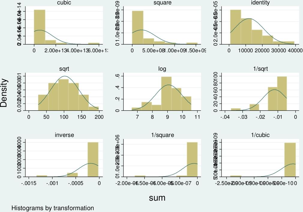 在该结果中,我们可以非常轻松地看出,在95%的置信水平上,仅有平方根变换square root(P(chi2)= 0.729)以及自然对数变换log(P(chi2)= 0.077)是符合正态分布的,其他幂次的数据变换都不能使数据显著地呈现正态分布。