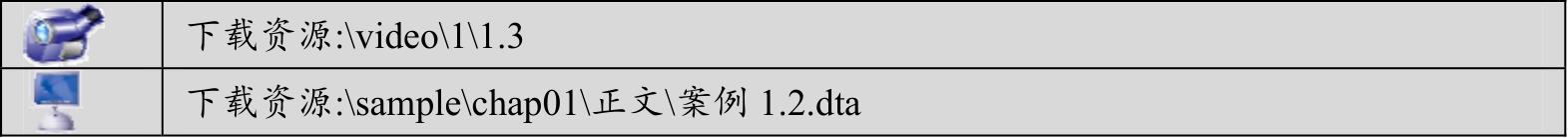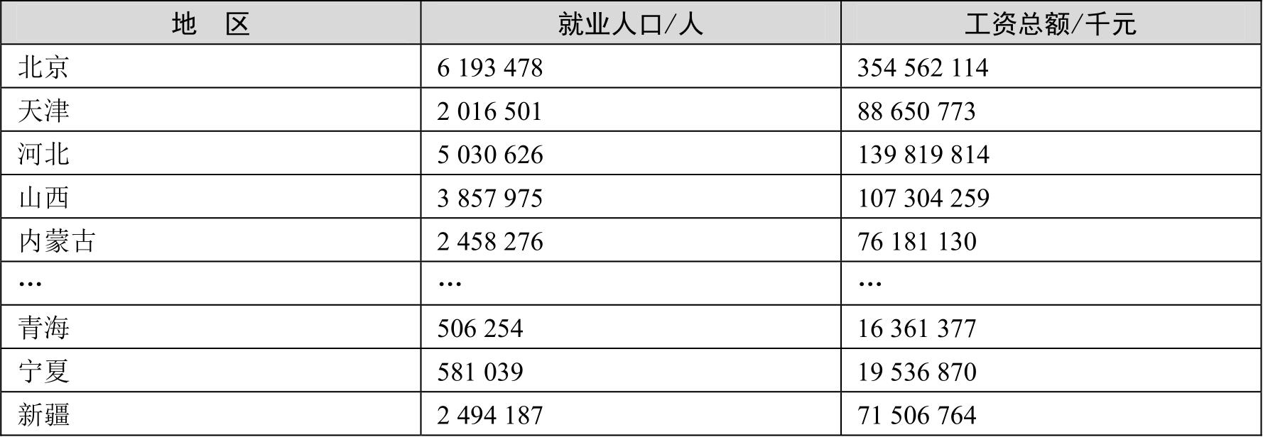 【例1.2】 我国2009年各地区的就业人口及工资总额数据如表1.2所示。使用Stata命令进行操作:(1)试生成新的变量来描述各地区的平均工资情况;(2)试生成平均工资变量来替代原有的工资总额变量;(3)对生成的平均工资变量数据均做除以10的处理;(4)对就业人口变量进行对数平滑处理,从而产生新的变量。