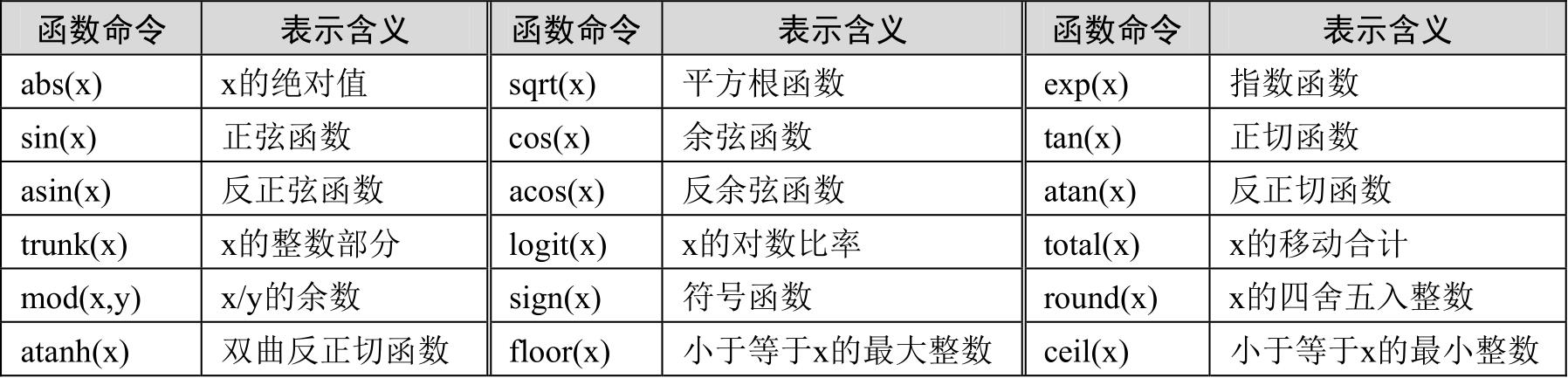 在上面的案例中,我们也用到了自然对数函数ln(变量)。在Stata 16.0中,我们经常使用的函数如表1.4所示。