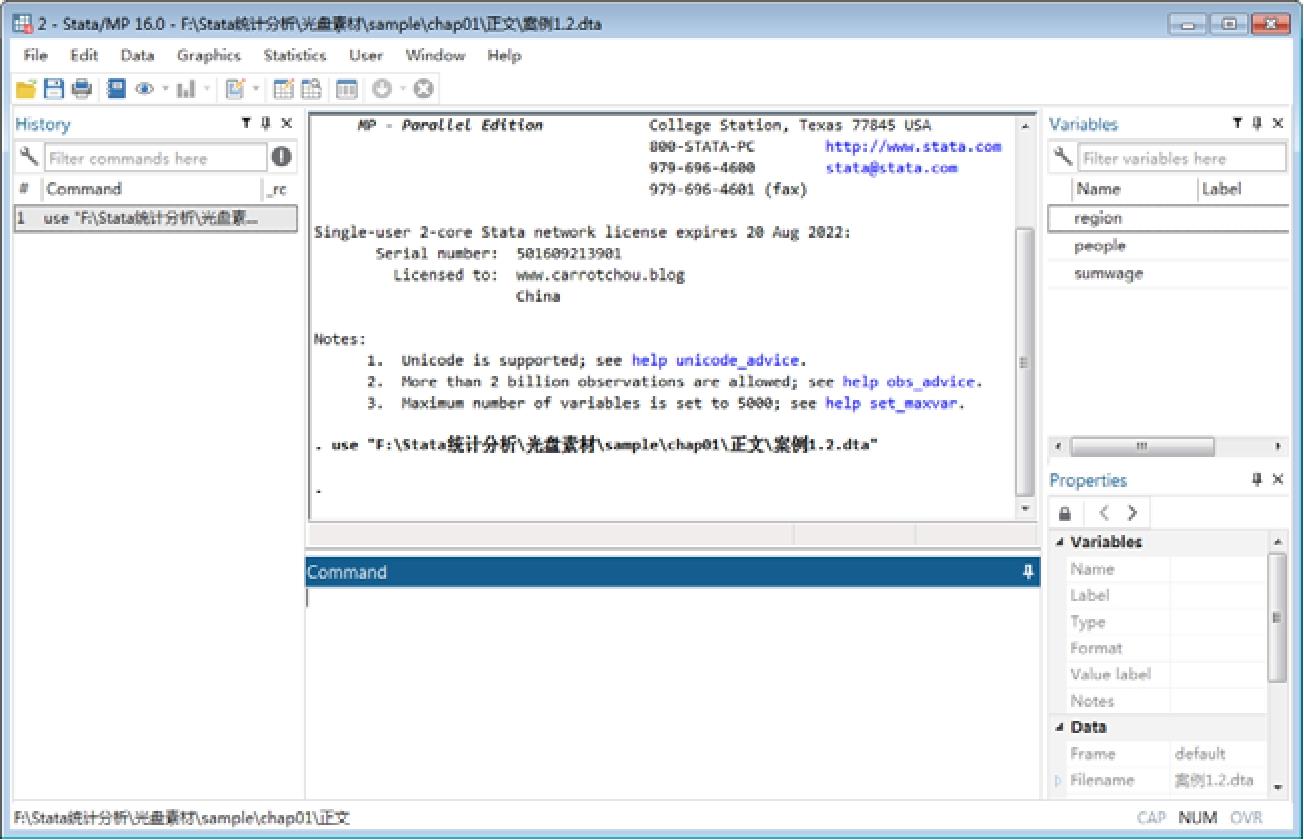 进入Stata 16.0,打开相关数据文件,弹出如图1.15所示的主界面。