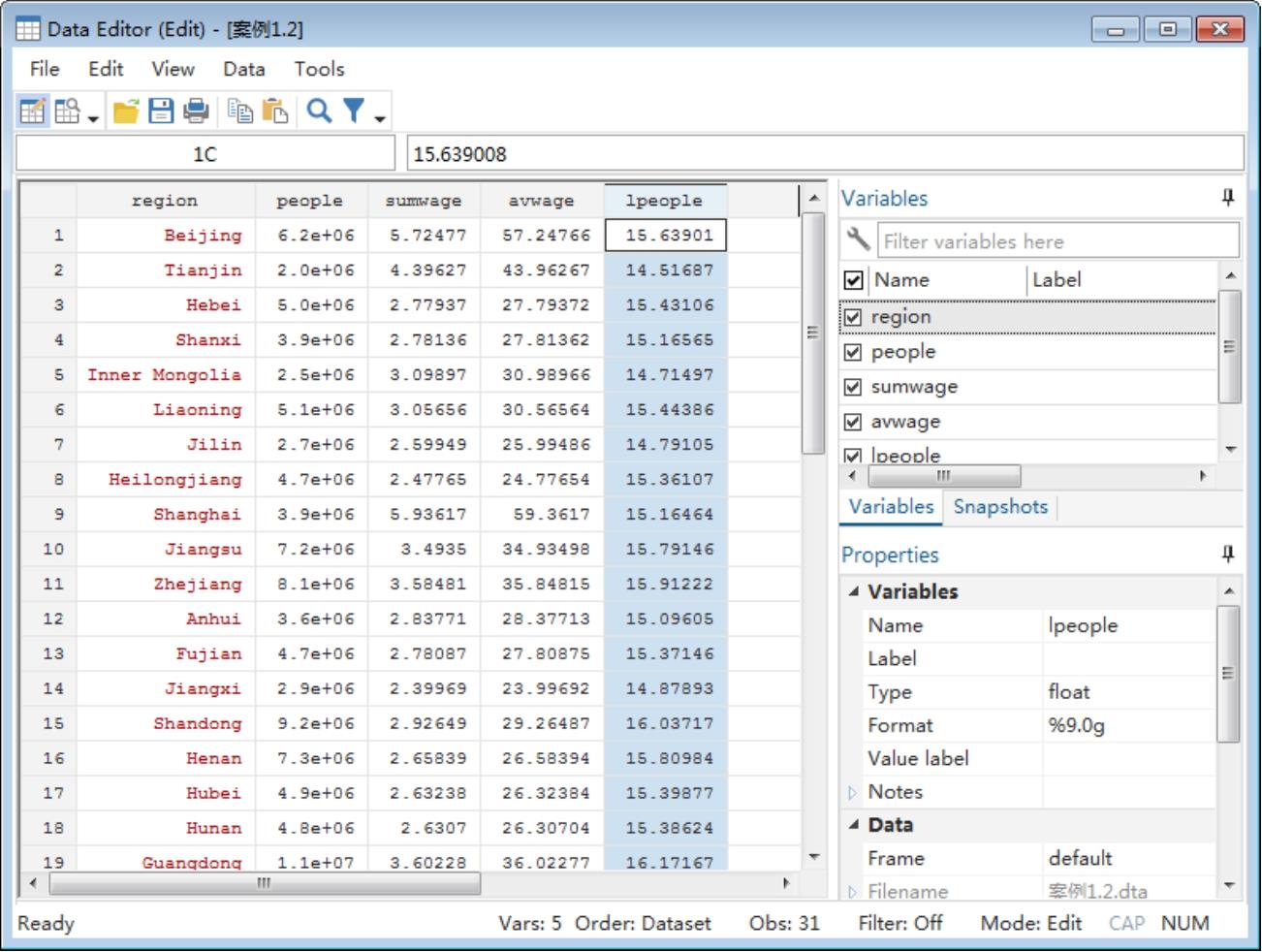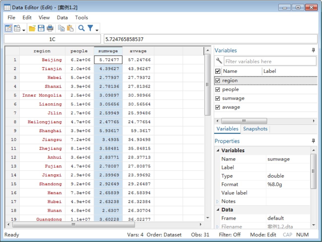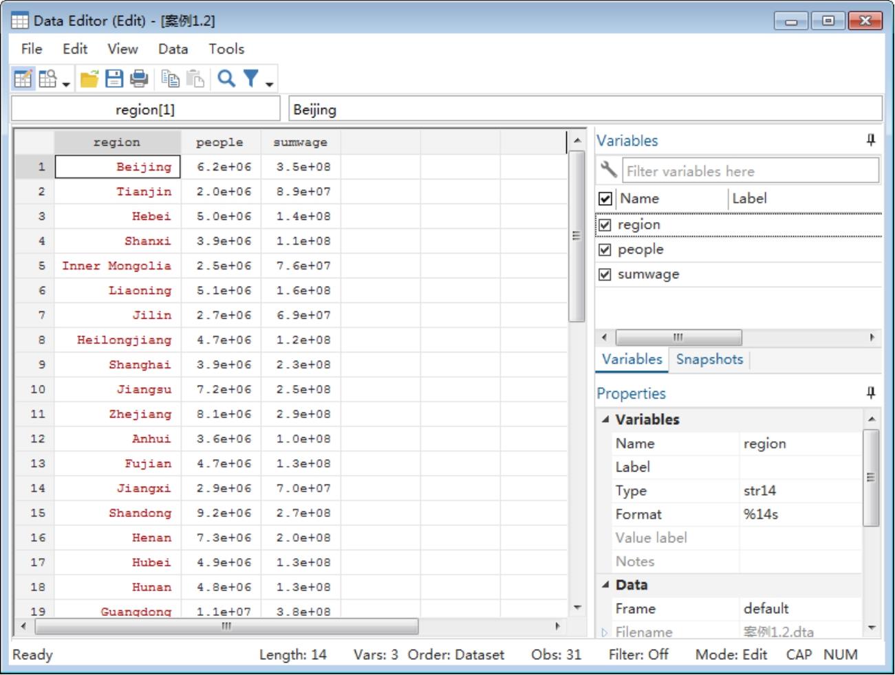 在用Stata进行分析之前,我们要把数据录入Stata中。本例中有3个变量,分别是地区、就业人口和工资总额。我们把地区变量设定为region,把就业人口变量设定为people,把工资总额变量设定为sumwage,变量类型及长度采取系统默认方式,然后录入相关数据。相关操作在1.2节中已详细讲述过了。录入完成后,数据如图1.14所示。