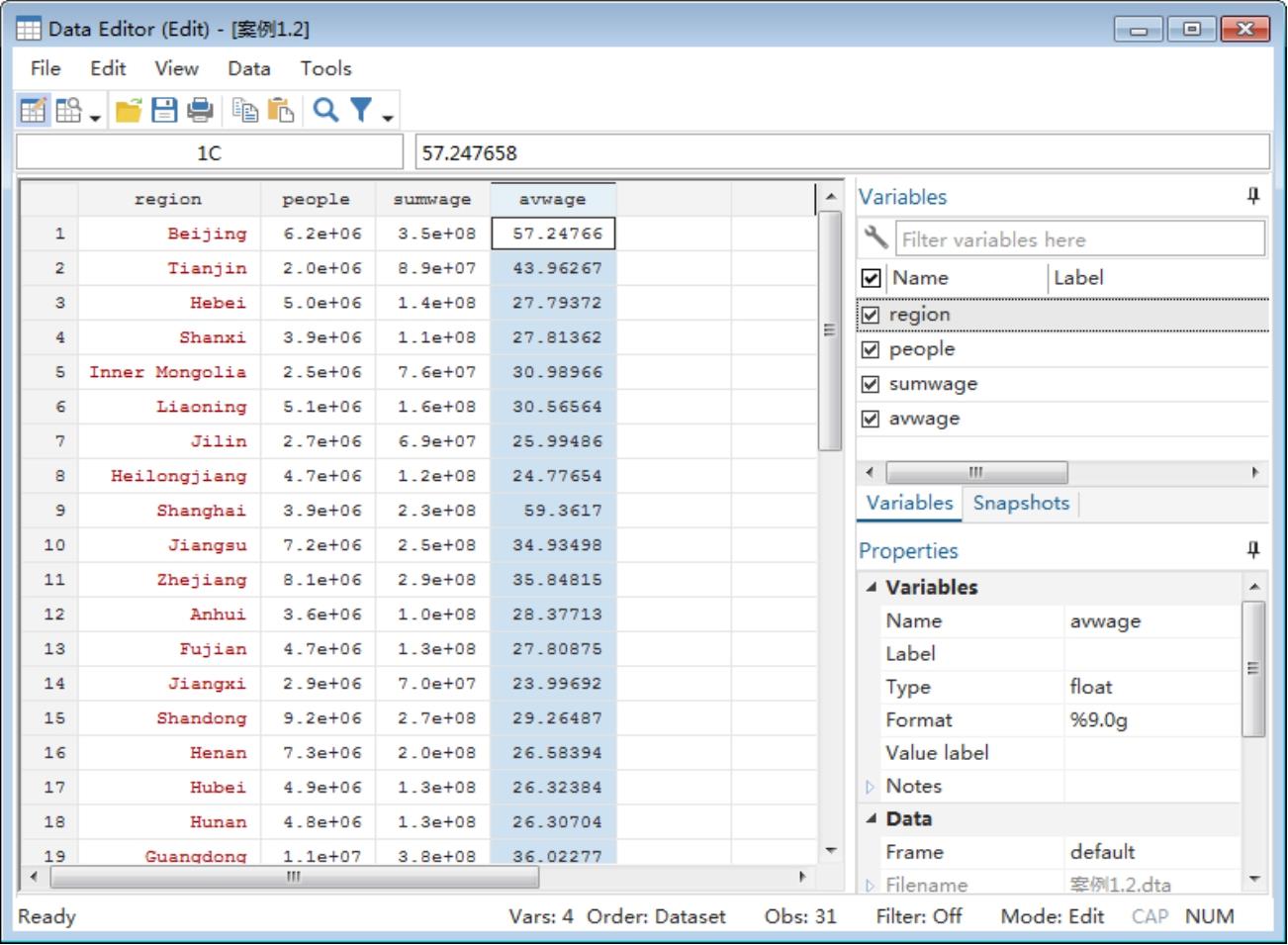 选择Data|Data Editor|Data Editor(Browse)命令,进入数据查看界面,可以看到如图1.16所示的avwage数据。