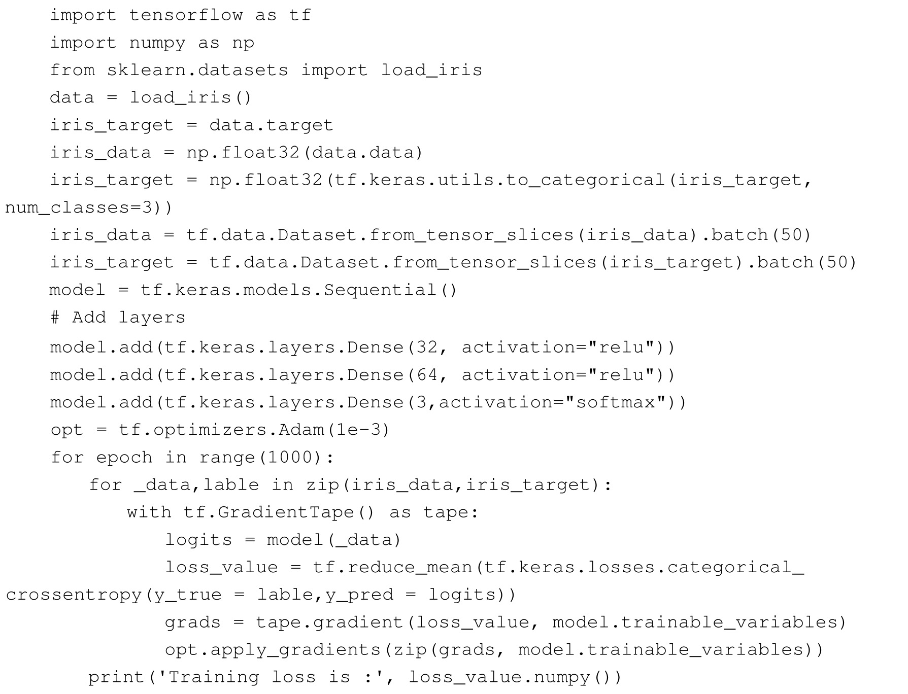 在2.1.2小节中,笔者使用了符合传统TensorFlow习惯的梯度更新方式对参数进行更新。然而,这种看起来符合编程习惯的梯度计算和更新方法可能并不符合大多数有机器学习使用经验的读者的习惯。本小节以修改后的iris分类为例讲解标准化TensorFlow的编译方法。