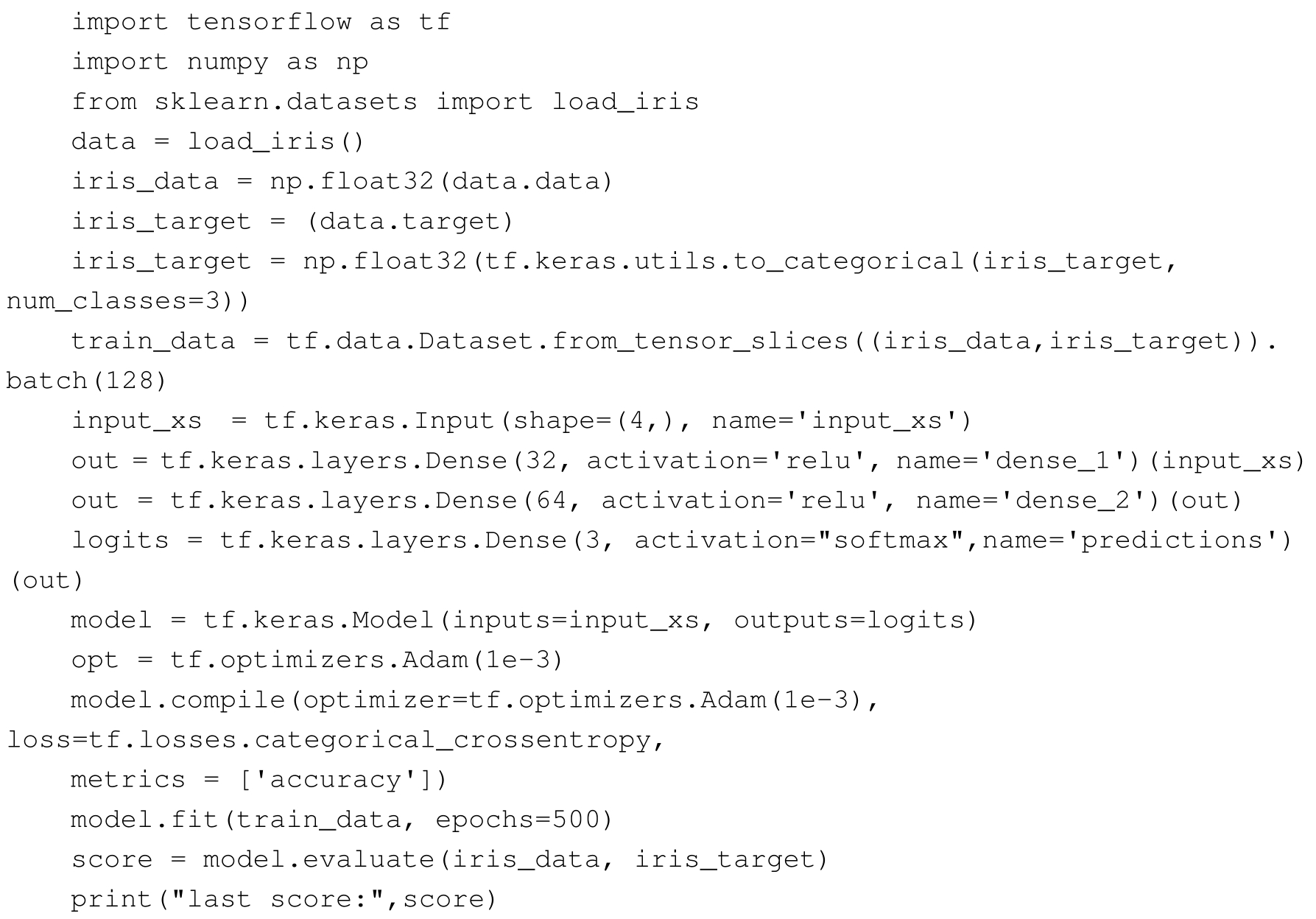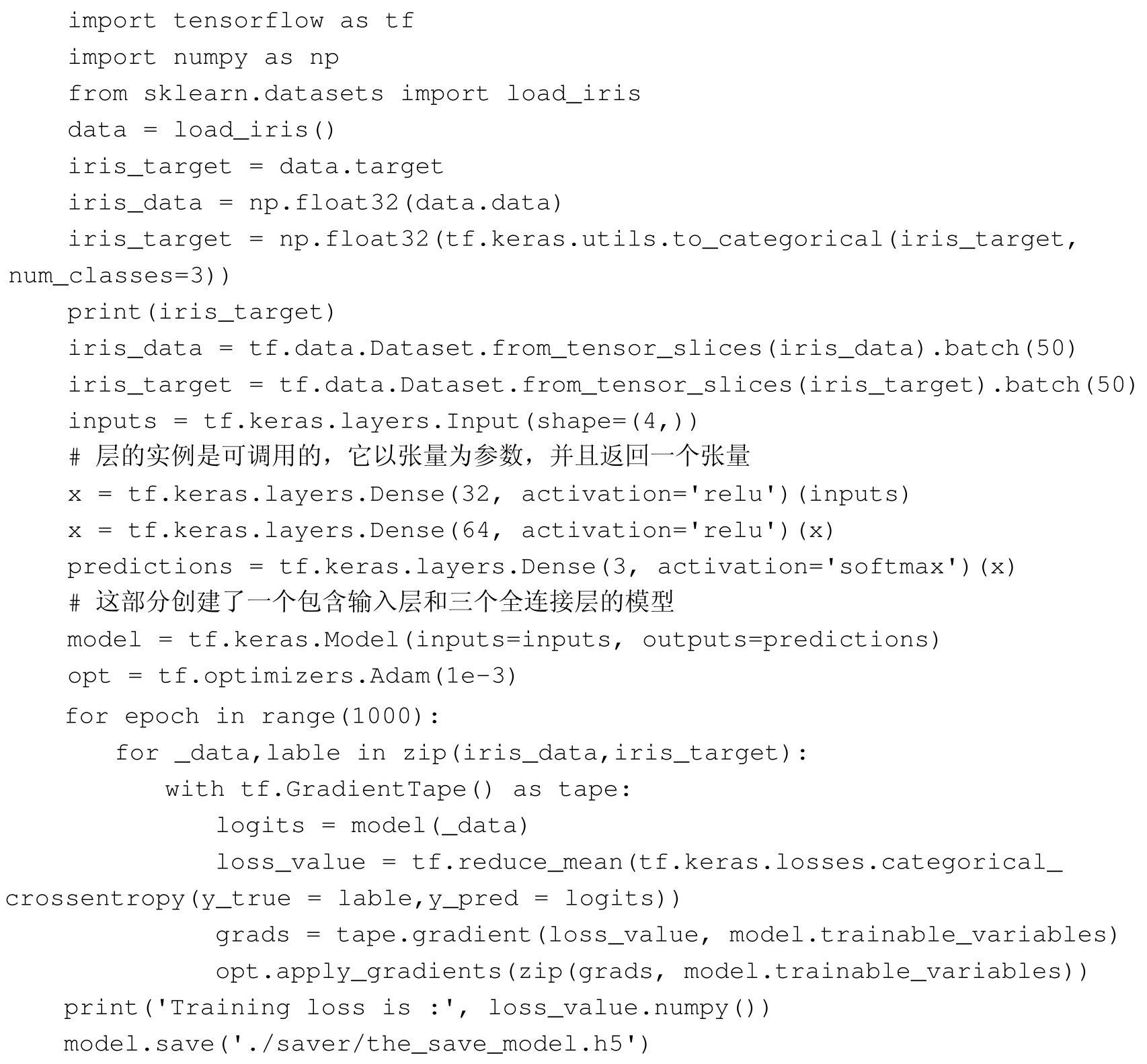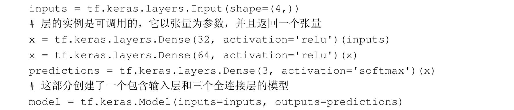 函数式编程方法类似于传统的编程,只需要建立模型导入输出和输出“形式参数”即可。有TensorFlow 1.X编程基础的读者,可以将其看作一种新格式的“占位符”。其代码如下: