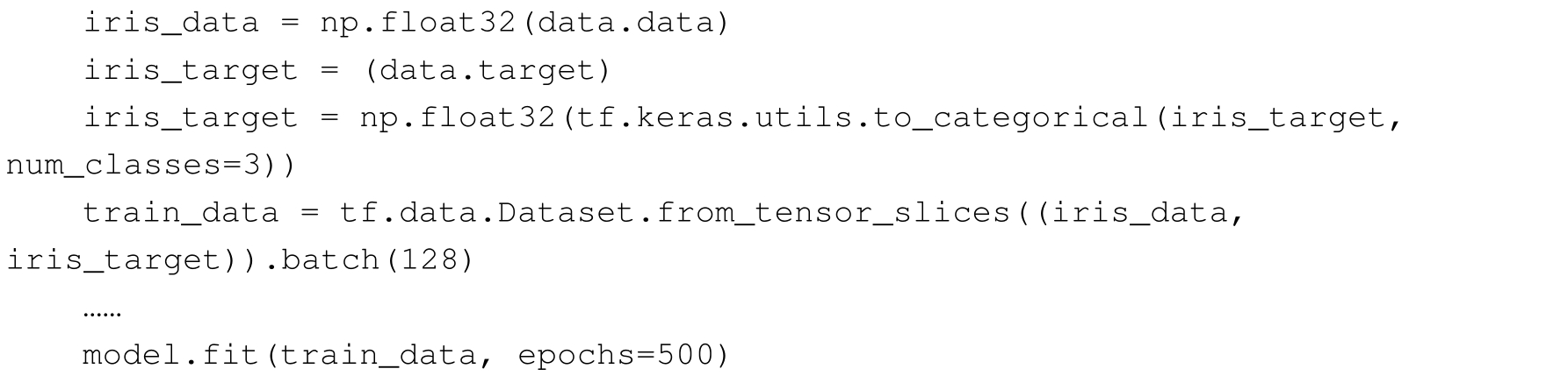 在程序2-6中数据的准备是使用tf.data API完成的,即通过打包的方式将数据输出,也可以直接将输入的数据输入模型中进行训练,代码如下: