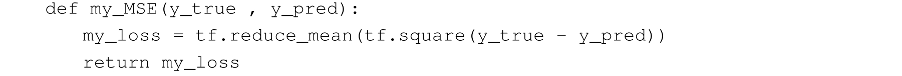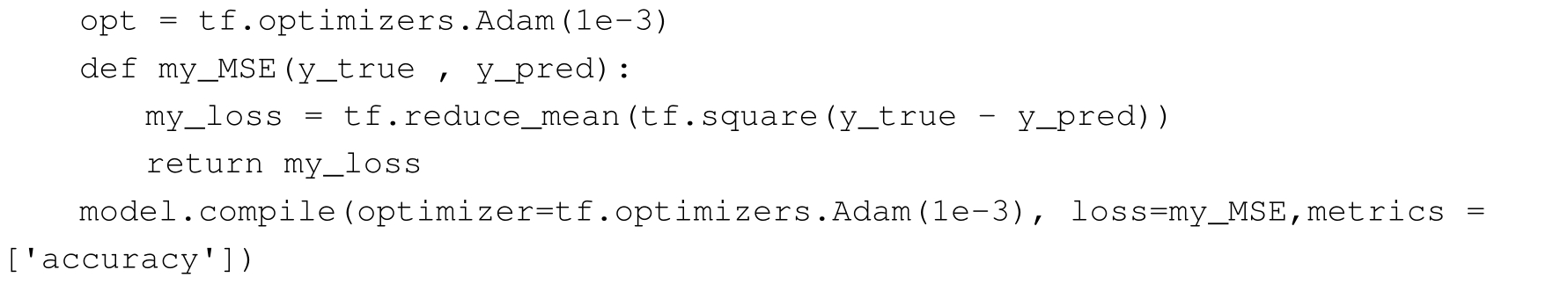 举一个例子,在上面的编译器中,我们传递的是一个TensorFlow自带的损失函数,而实际上往往由于针对不同的计算和误差需要不同的损失函数,这里自定义一个均方差(MSE)损失函数,代码如下: