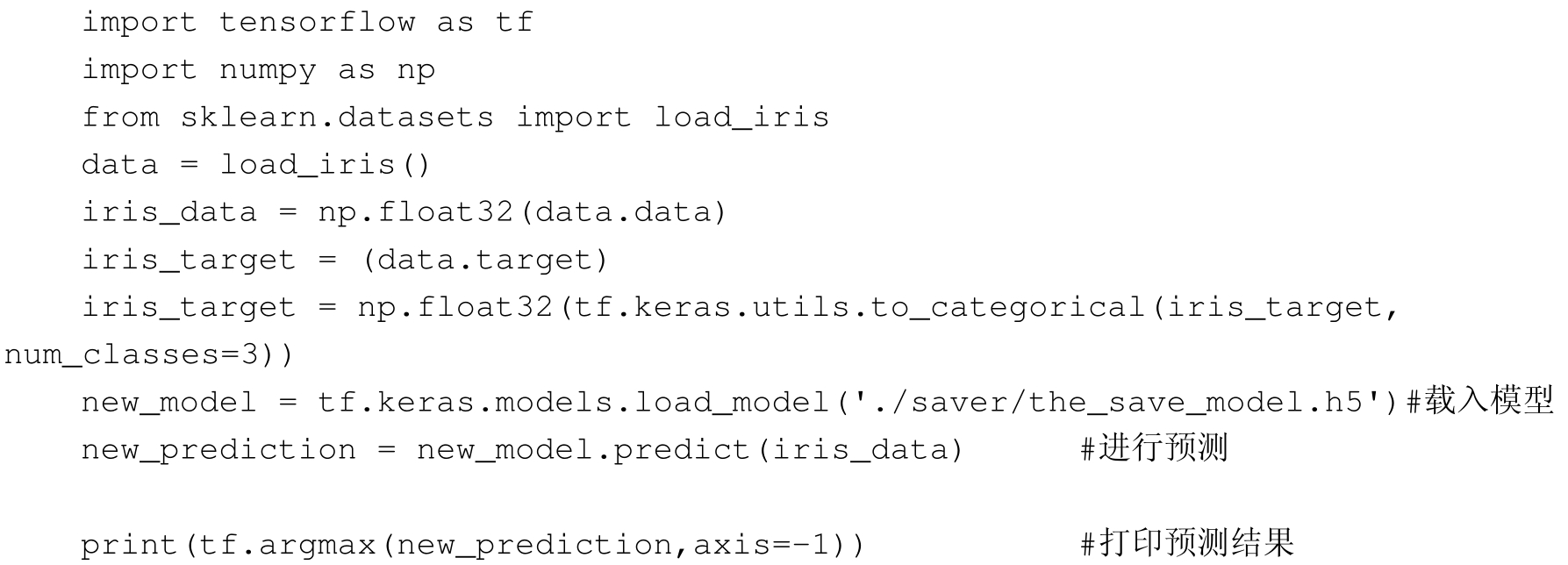 程序2-2的基本架构对照前面的例子没有多少变化,损失函数和梯度更新方法是固定的写法,这里最大的不同在于,使用了model自带的saver函数对数据进行保存。在TensorFlow 2.1中,数据的保存由Keras完成,即将图和对应的参数完整地保存在h5格式中。