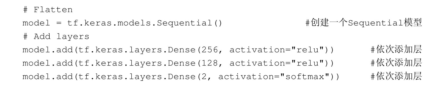 可以看到,这里首先创建了一个Sequential模型,之后根据需要逐级向其中添加不同的全连接层,全连接层的作用是进行矩阵计算,而相互之间又通过不同的激活函数进行激活计算(这种没有输入输出值的编程方式,对有经验的程序设计人员来说并不友好,仅供举例)。
