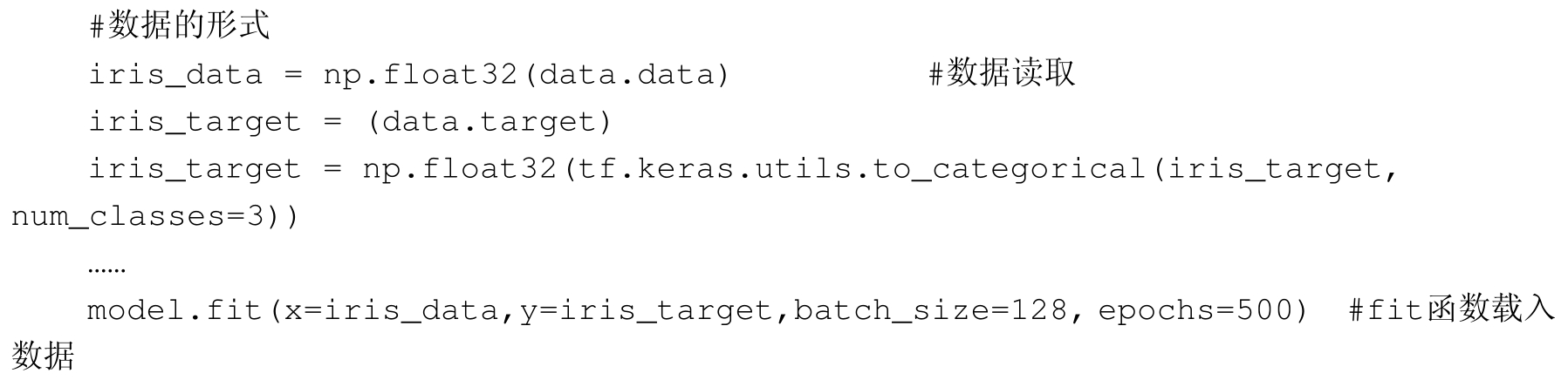 对于大多数机器学习的程序设计人员来说,往往习惯了使用fit函数和compile函数进行数据载入和参数分析,代码如下: