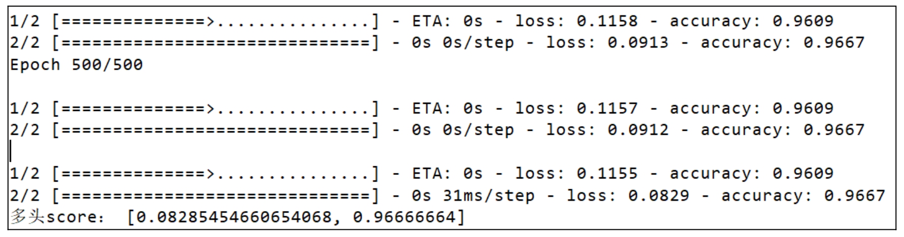 首先是对数据的修正和设计,数据的输入被平均分成两组,每组有两个特征。这实际上没什么变化。而对于特征的分类,在引入One-Hot处理的分类数据集外,还保留了数据分类本身的真实值做目标的辅助分类计算结果。无论是多输入还是多输出,此时都使用打包的形式将数据重新打包成一个整体的数据集合。