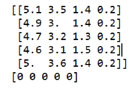 这里分别打印了前5条数据。可以看到,iris数据集中的特征是分成4个不同特征进行数据记录的,而每条特征又对应一个分类表示。