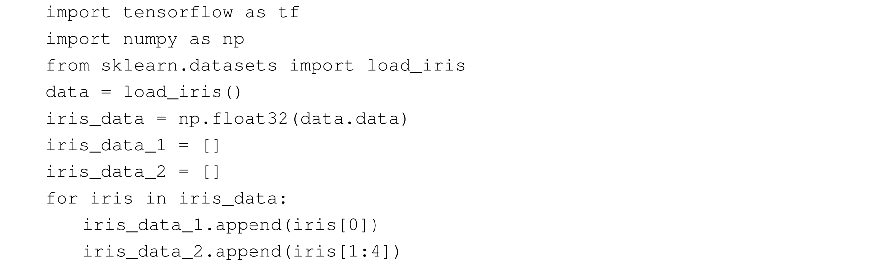 从前面的介绍可以知道,iris数据集每行是一个由4个特征组合在一起表示的特征集合,此时可以人为地将其切分,即将长度为4的特征转化成长度为3和长度为1的两个特征集合,代码如下: