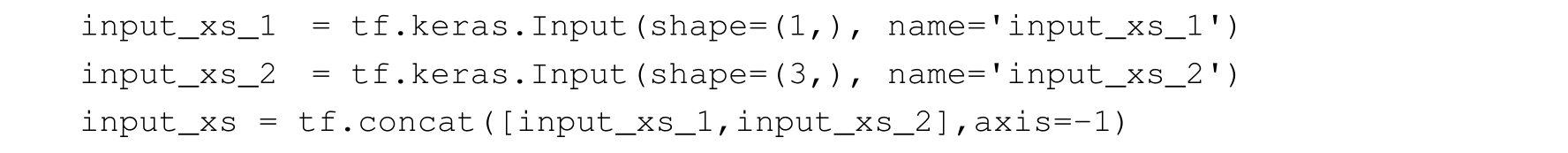 可以看到代码中分别建立了input_xs_1和input_xs_2作为数据的接收端接收传递进来的数据,之后通过一个concat重新将数据组合起来,恢复成一条4个特征的集合。