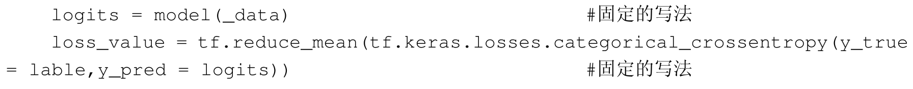 首先通过模型计算出对应的值。这里内部采用的是前向调用函数,读者知道即可。之后使用tf.reduce_mean计算出损失函数。