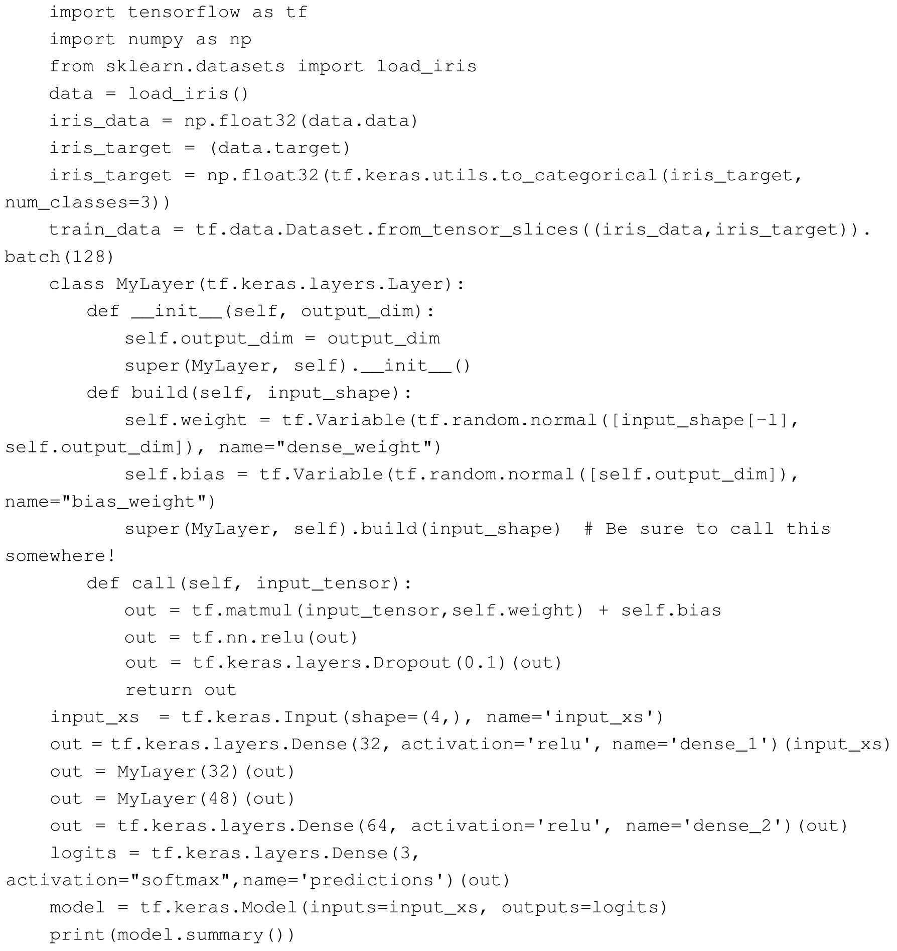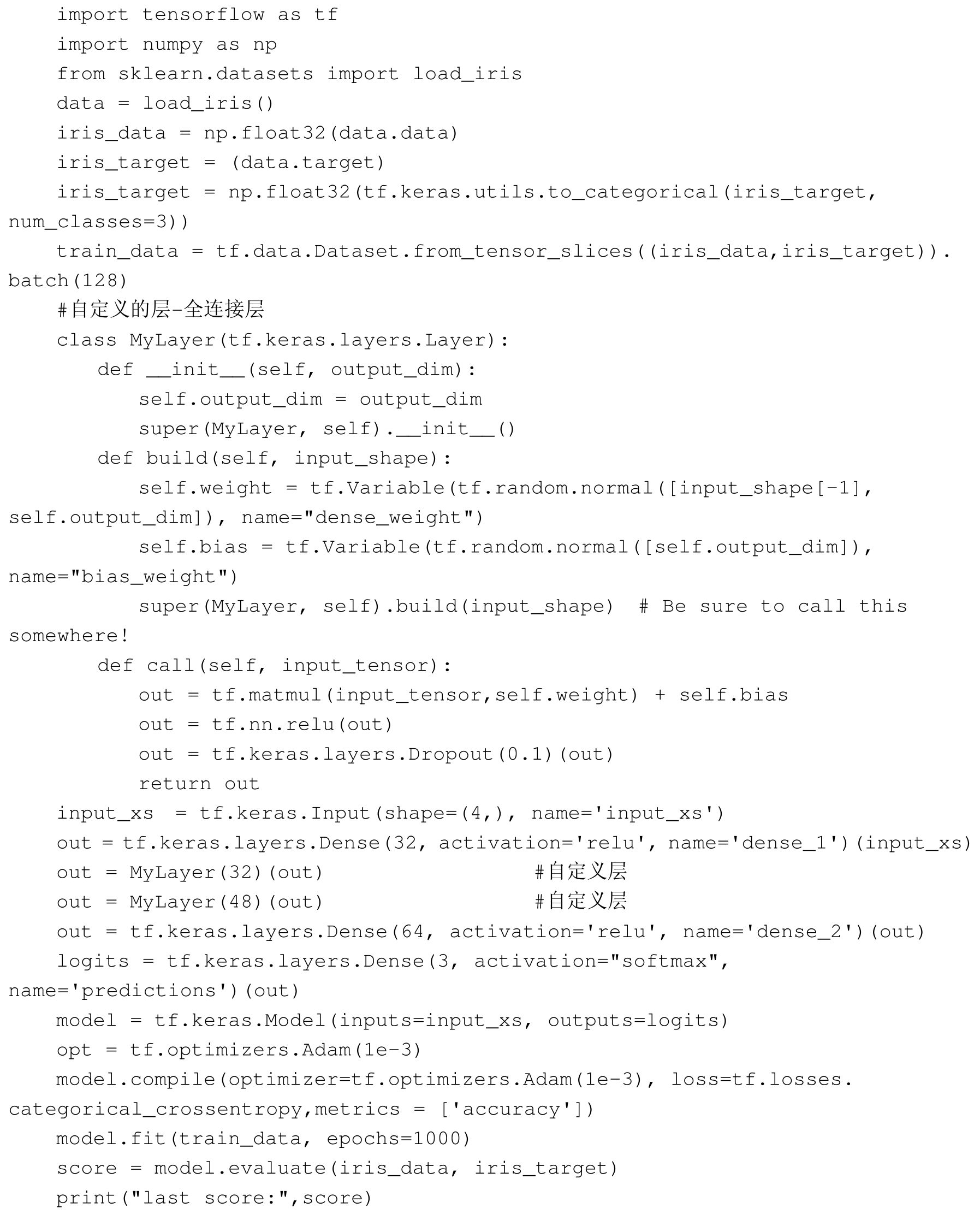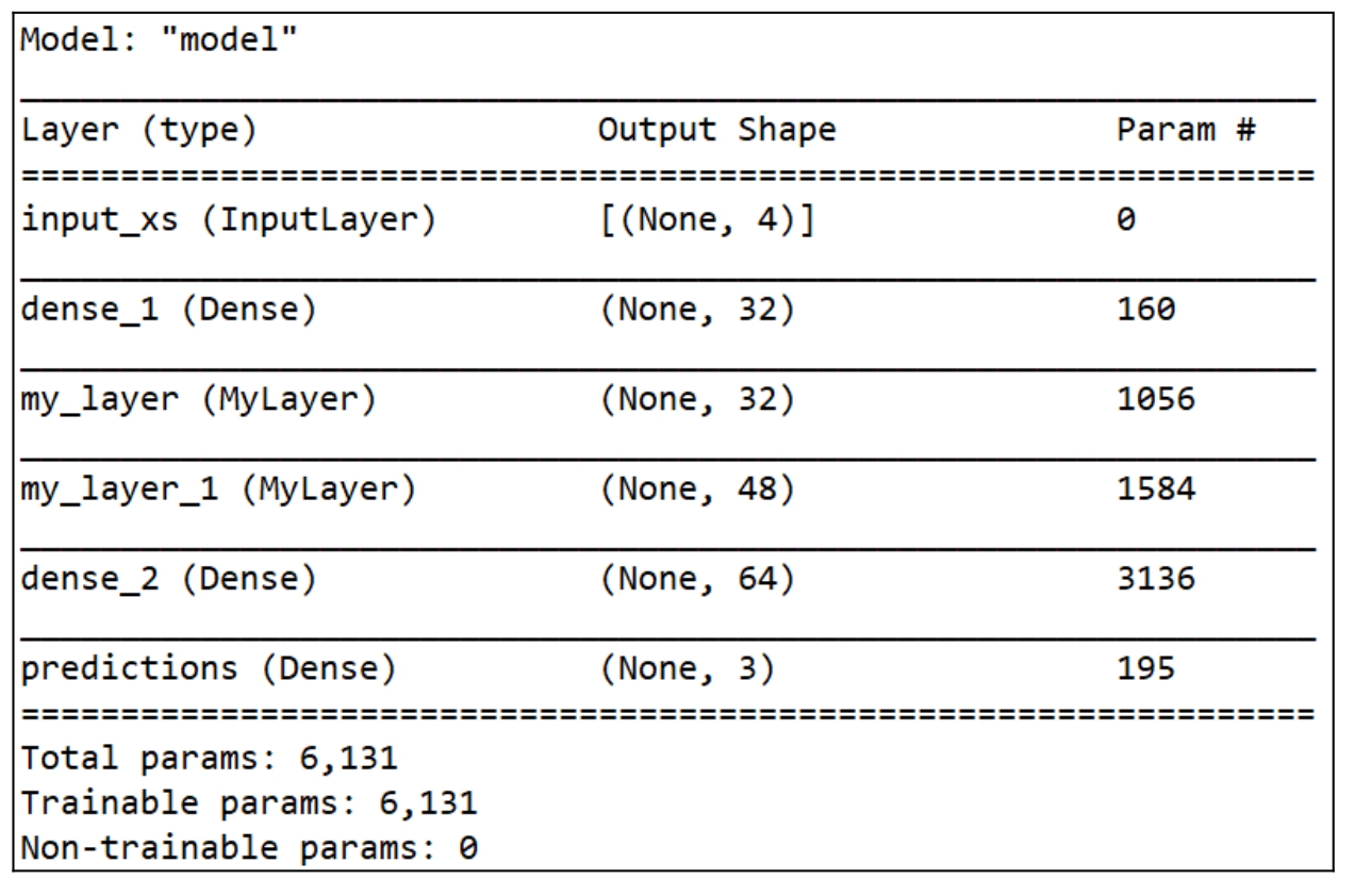 我们首先定义了MyLayer作为全连接层,之后正如使用TensorFlow自带的层一样,直接生成类函数并显式指定输入参数,最终将所有的层加入Model中。最终打印结果如图2.13所示。