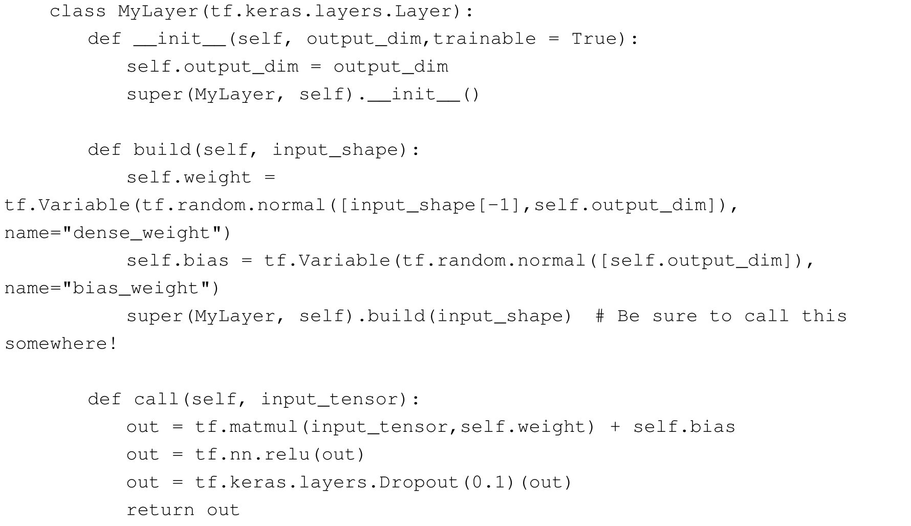 代码最后的super(MyLayer,self).build(input_shape),目前读者只需要记得这种写法,在build的最后确定参数定义结束。