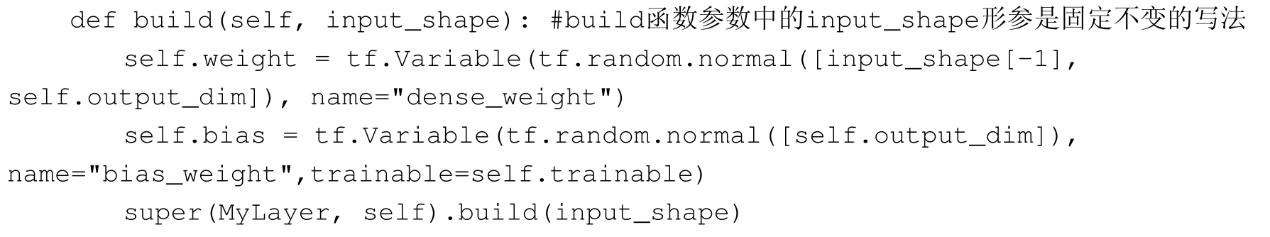 build函数参数中的input_shape形参是固定不变的写法,读者不需修改,其中自定义的参数需要加上self,表明是在类中使用的全局参数。