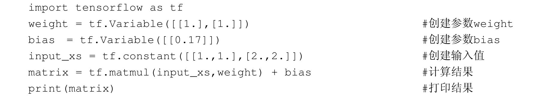 下面举一个例子,使用TensorFlow自带的API实现一个简单的矩阵计算。