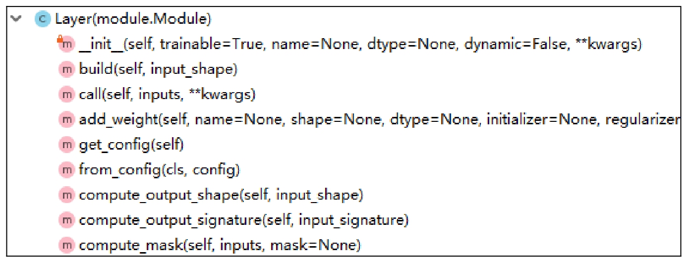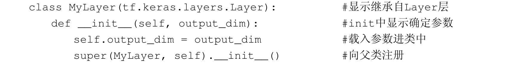 在TensorFlow中,任何一个自定义的层都是继承自tf.keras.layers.Layer,我们将其称为“父层”,如图2.12所示。这里所谓的自定义层实际上是父层的一个具体实现。