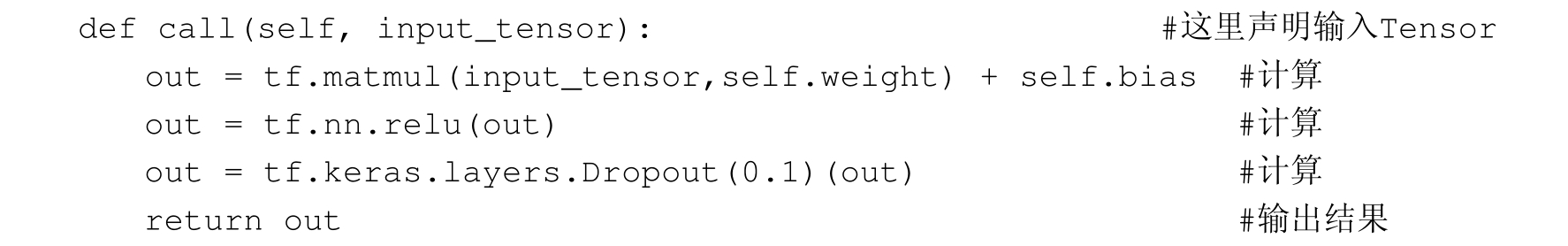 可以看到call中的一系列操作是对__init__和build方法中变量参数的应用,所有的计算都在call函数中完成。需要注意的是,输入的参数也在这里出现,经过计算后返回计算值。