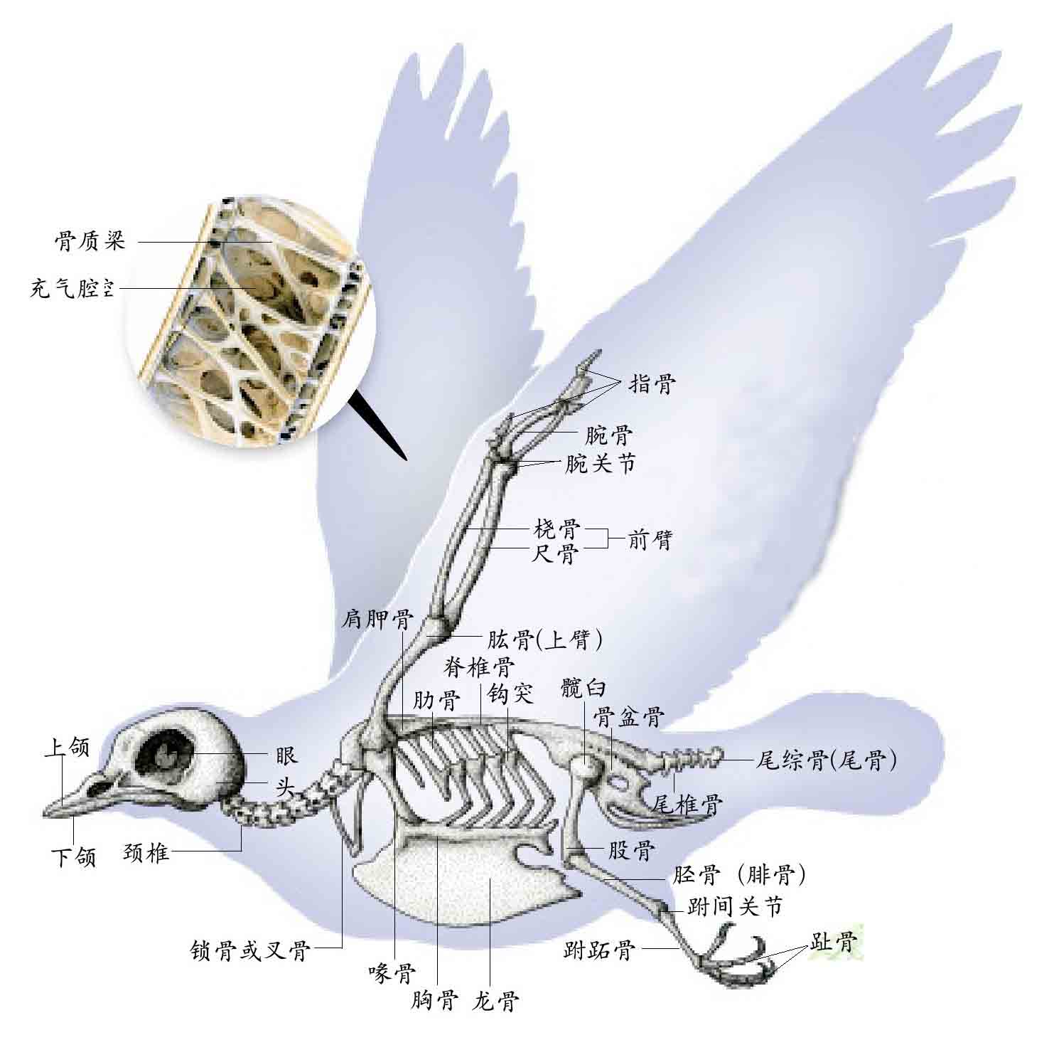 为了高效率的飞行,鸟类需要轻盈而紧凑的骨骼。骨骼中空(见上图,注意交错的骨质梁,这是鸟类维持力量的必要成分)和重量集中于重心附近,使这一要求得到了实现。注意图中大块的胸骨,那是大量飞行肌着生的地方。