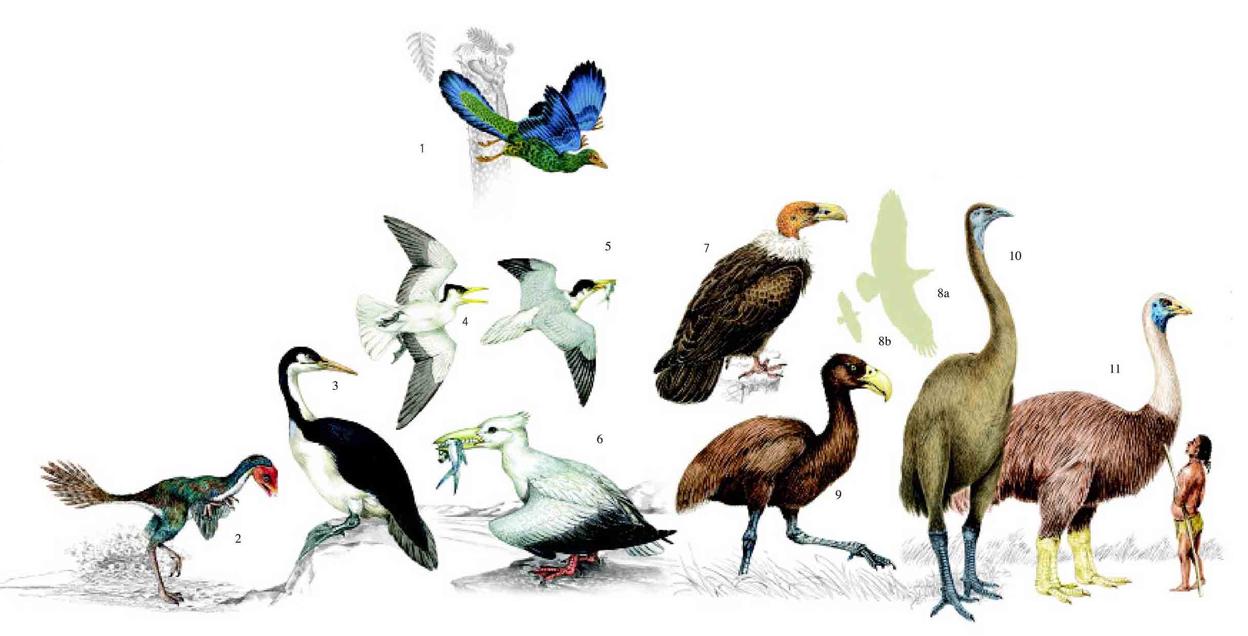 1.始祖鸟,已知的最古老的鸟,源于侏罗纪晚期(约1.47亿年前)。2.尾羽龙,距今约1.25亿年,为前肢短、长有原始羽毛但不能飞行的兽脚类恐龙。3.黄昏鸟,白垩纪早期的长牙水禽,距今约7000万~9000万年,是从飞鸟演变而来的不会飞的鸟种。4和5.鱼鸟和虚椎鸟,为同一时期的鸟种,外形酷似现代燕鸥。6.齿鸟,始新世时期(约5500万~3400万年前)的长翼海鸟,喙部有齿状的锯齿。7.巨翼鸟,更新世时期(约180万~1万年前)兀鹫状的巨型鸟类,发现于洛杉矶的拉布里沥青坑,据传该鸟的翼展可达7米。8a和8b.庞大的阿根廷巨鸟的飞行身影与现代白头海雕的对比。9.古新世和始新世时期的营穴鸟,直立达2.2米,胸骨无龙骨,不会飞。灭绝较晚的是巨型平胸类鸟——恐鸟和象鸟。10.伟恐鸟,为6个恐鸟种类中最大的种,栖息于新西兰;恐鸟最终在19世纪灭绝。11.生活于马达加斯加的象鸟。