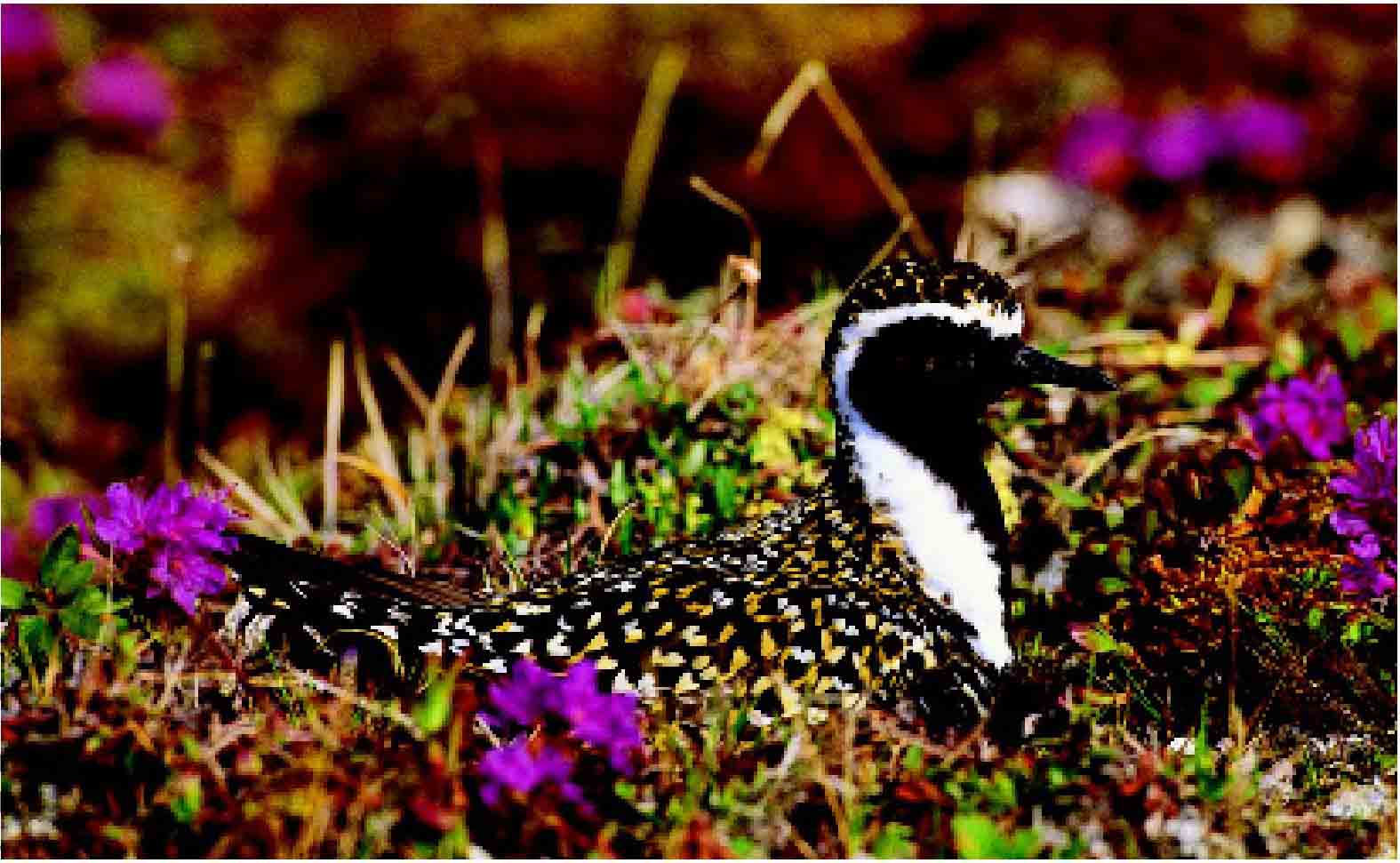 有些鸟类,特别是在地面筑巢的种类(图中为一只金斑鸻),羽毛的色彩和图案具有保护性,能使它们把自己伪装起来,从而将被天敌发现的风险降至最低。