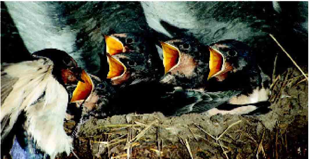 燕子等鸟类的发育模式与灰鹤等截然不同,它们的雏鸟孵化时双目紧闭,完全没有自理能力,一直留在巢中直至羽翼丰满、能够飞翔为止。这种留于巢中(孵化留巢型)的雏鸟典型的特征是嘴部和消化器官很大。它们一般需要在巢中待23天左右。