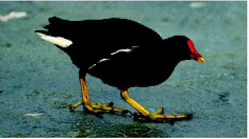 上述鸟类中绝大多数用蹼足(见图1)游泳。但有些种类如鸊䴘、骨顶,鳍趾和瓣蹼鹬则具有瓣趾(见图2)而非蹼趾,而其他的秧鸡科鸟类如黑水鸡(见下图)仅仅是通过长趾底部变宽来形成划水面。少数水栖鸟类如企鹅和海雀,在水中时主要依靠它们的翼来获得推力,企鹅(以及已灭绝的大海雀)的翼已丧失飞行功能。有一两种飞鸟如海番鸭,潜水时会利用折翼来获得某种推力,如果完全展开则会因太大而无法使用。对于一只潜水的鸟来说,能否潜入水下是一大难题,因为一般而言,鸟类比水轻得多。不过,相比之下,大部分潜水的鸟都具有较高的密度,并且在潜水时能够把羽毛中的大量气体“挤”出来,以减轻浮力。鸬鹚的羽毛特别容易浸湿,故能轻松排除空气,这也是为什么鸬鹚在捕鱼之后总是站在那里摊开翅膀等着晾干的原因。此外,据说还有通过吞咽石子的办法来增加身体比重的。