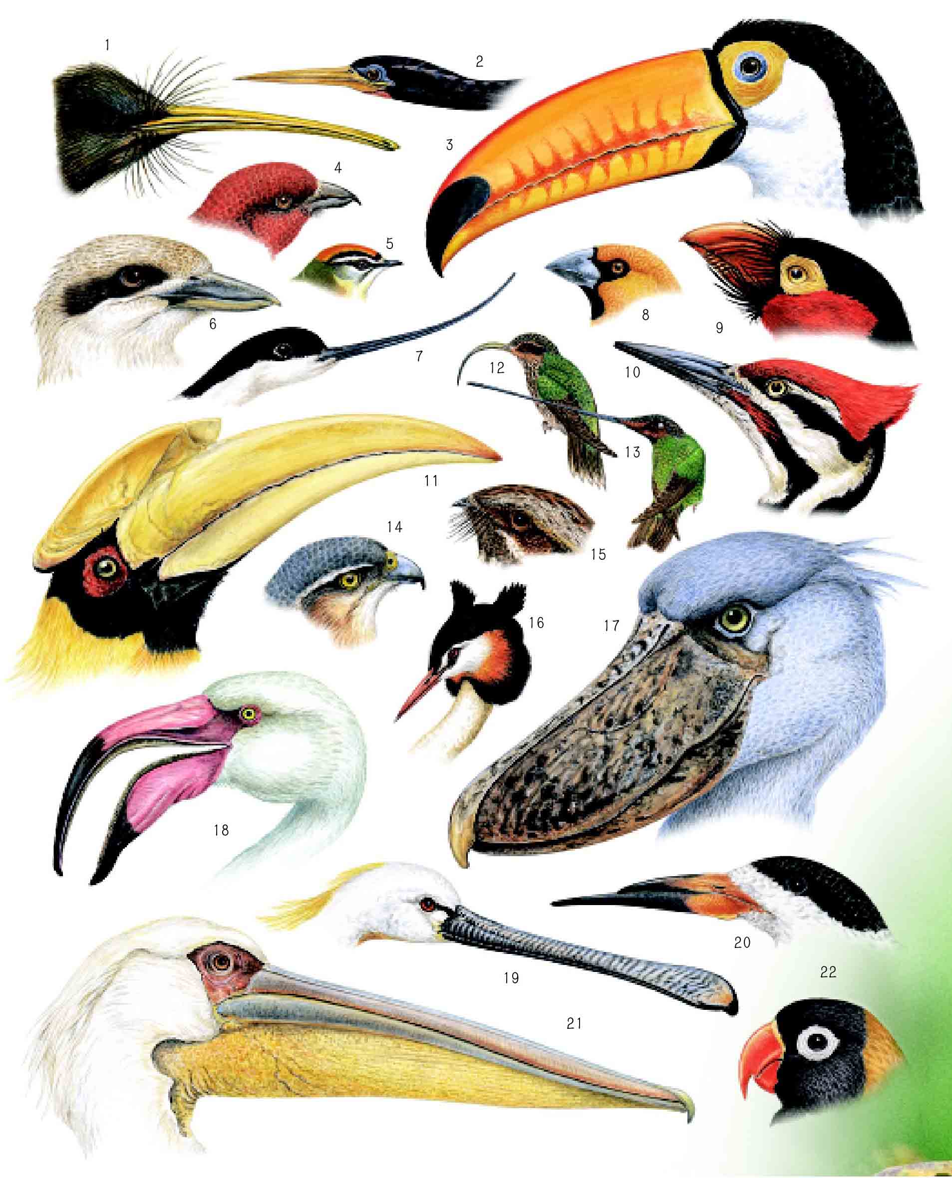 不同的鸟喙形状适应于应对各种不同的食物。1.褐几维(食蠕虫和其他无脊椎动物);2.蛇鹈(食鱼);3.巨嘴鸟(食果实);4.红交嘴雀(食种子);5.戴菊(食昆虫和毛虫);6.笑翠鸟(食蜘蛛、小型无脊椎动物、水生虫和鱼);7.反嘴鹬(食软体动物、甲壳类动物和小型水生无脊椎动物);8.锡嘴雀(食硬壳种子);9.双齿拟鴷(食果实和硬浆果);10.大金背啄木鸟(食节肢动物);11.双角犀鸟(食果实,尤其是无花果);12.白尾尖弯嘴鸟(食曲冠类尤其是海里康的花蜜);13.刀嘴蜂鸟(食长冠类的西番莲花蜜);14.雀鹰(食小鸟);15.翎翅夜鹰(食昆虫);16.凤头(食鱼、甲壳动物和软体动物);17.鲸头鹳(食肺鱼、蛙、龟和蛇);18.大红鹳(食海藻、硅藻及小型水生无脊椎动物);19.白琵鹭(食小鱼和虾);20.剪嘴鸥(食小鱼和甲壳动物);21.卷羽鹈鹕(食鱼、两栖类动物和小型哺乳动物);22.黄领牡丹鹦鹉(食种子、坚果和浆果)。