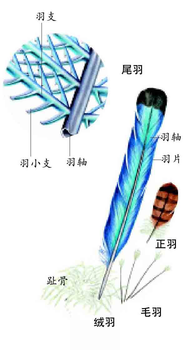 尾羽(下图详细显示了羽支是如何钩结在一起的。羽小支上有钩,从而能够相互钩结起来。一旦分开,鸟会用喙将它们梳理至原位)和正羽覆盖于体表,具有防水、绝热和提供羽色等功能;毛羽散布于全身羽毛中间,但主要集中在眼和喙周围(不过那里的毛羽没有端部羽支),用以提供感觉方面的功能;绒羽一般出现在雏鸟身上,但许多成鸟的羽毛里层也长有绒羽,如需要增加保温性能的水禽类。