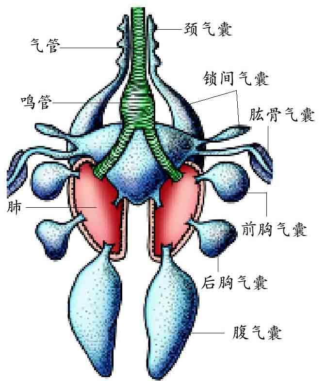 鸟类的肺相对较小,但有多个气囊相助,可以最大限度地将氧气融入血液里。大部分鸟类拥有9个气囊,1个锁间气囊,2个颈气囊,2个前胸气囊,2个后胸气囊,2个腹气囊。这些气囊为肺的薄壁延伸物,作用是使气流单向通过肺。这种高效的呼吸形式保证鸟类可以不断地吸入含氧量高的新鲜空气。而细胞中的高含氧量使鸟类能够从食物中最大限度地获取能量,这对于飞行需要大量耗能的鸟类而言无疑至关重要。