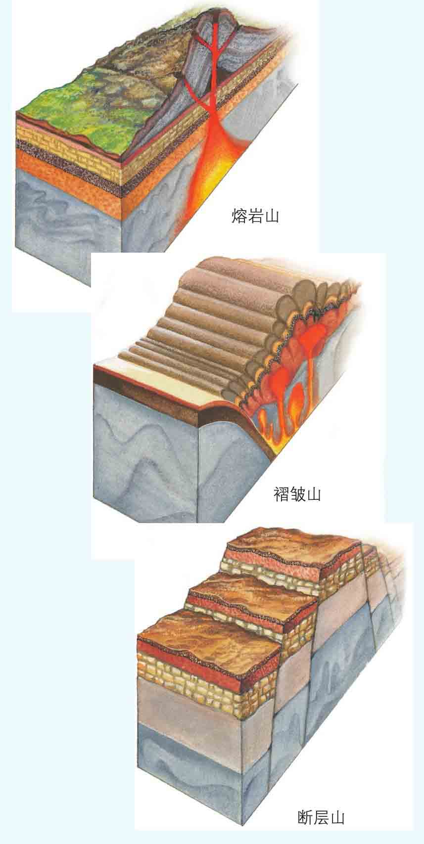地层是地壳表层呈带状分布的层状岩石。有些岩石是由沙、黏土等沉积物积聚而成的,还有一些是由火山喷发时喷出的岩浆经冷却而成的矿物岩石,称为火成岩,大多由玄武岩组成。褶皱山是由于地壳受到倾斜、褶皱和挤压等外力作用而形成的山地。