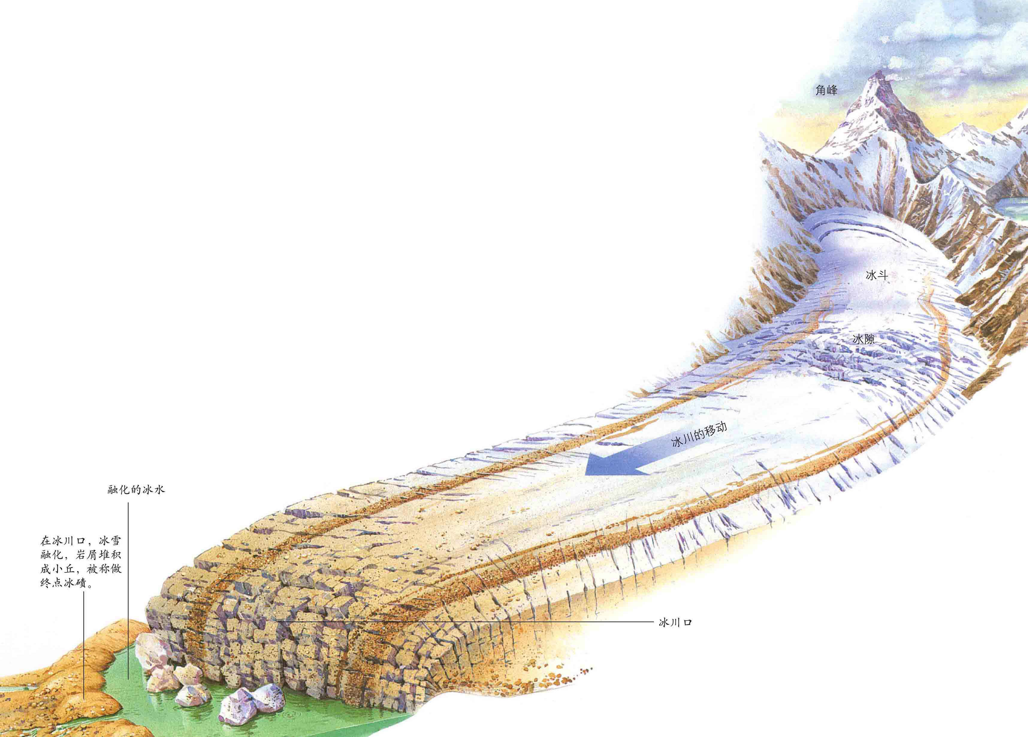 许多世纪以来,冰川已使地球面貌大为改观。冰川沿着峡谷向前移动时,把在谷底遇到的岩石及泥土都挖了出来。岩块碎石随着冰川前进,又把下面的基岩磨蚀,使冰蚀槽扩宽加深。北美洲五大湖、挪威沿海的峡湾、阿尔卑斯山高耸的马特杭峰,以及落基山脉都是冰川的杰作。