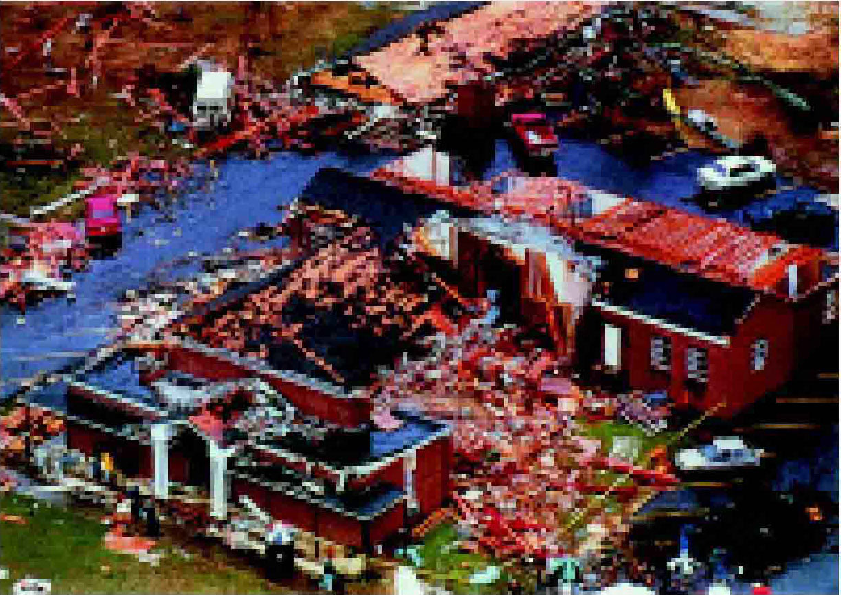 当龙卷风将旋转的气柱伸向地面,它中心的气压比正常大气压低几百毫帕,当气旋靠近建筑物时,建筑物内的空气向低气压区突然冲出,引起猛烈的爆炸。此图反映了美国佛罗里达州的一小城镇在龙卷风过后的狼藉景象。