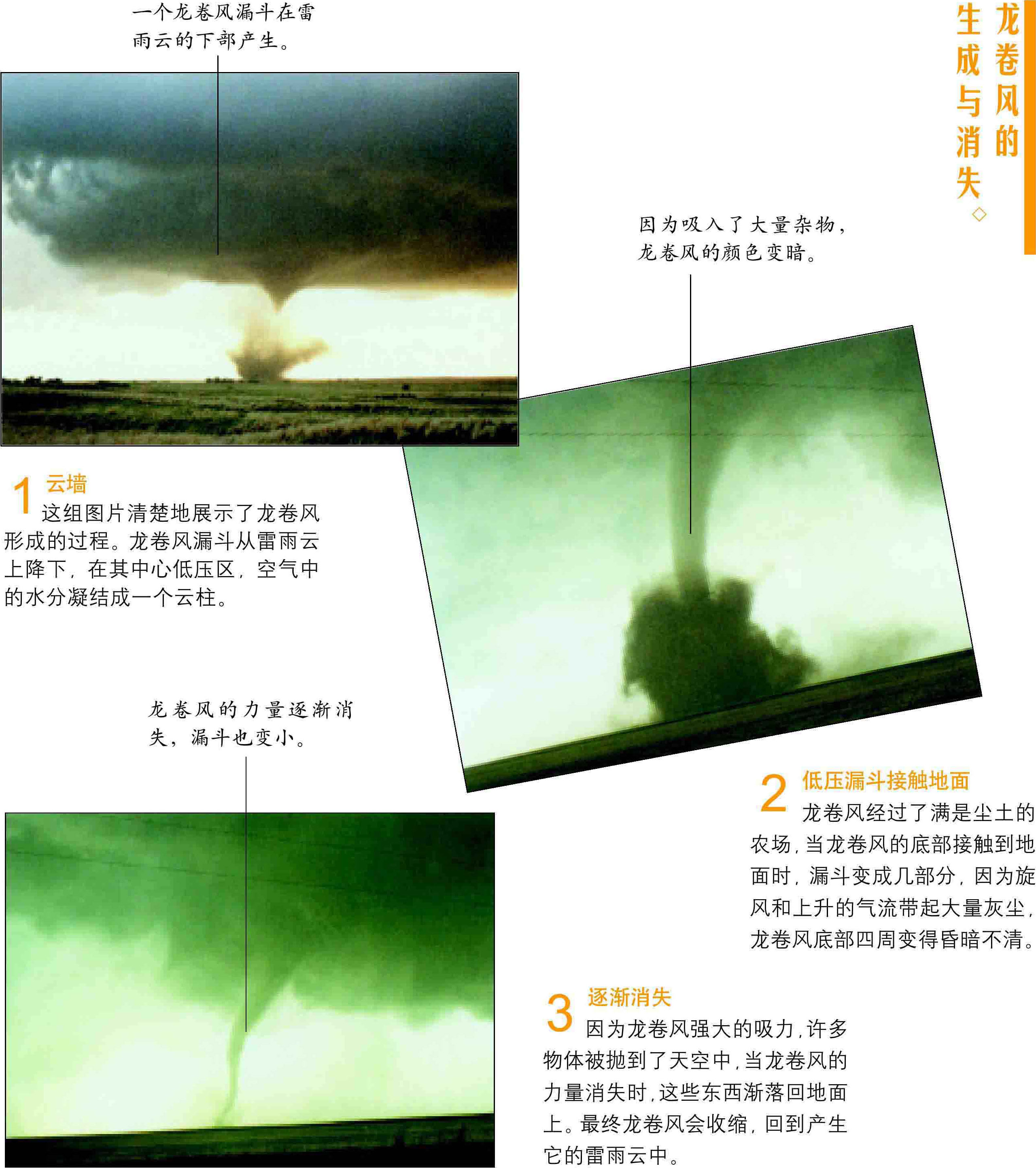 龙卷风是云层底部下垂的漏斗状的云柱及其伴随的非常强烈的旋风。文献上记载的下降银币雨、青蛙雨、黄豆雨、铁雨、虾雨,还有血淋淋的牛头从天而降等现象,都是龙卷风把地面或水中的物体吸上天空,带到远处,随雨降落造成的。龙卷风中心气压极低,中心附近气压梯度极大,产生强大的吮吸作用。当漏斗伸到陆地表面时,把大量沙尘等物质吸到空中,形成尘柱,称陆龙卷;当漏斗伸到海面时,便吸起高大的水柱,称水龙卷或海龙卷。龙卷的袭击突然而猛烈,产生的风是地面上最强的。