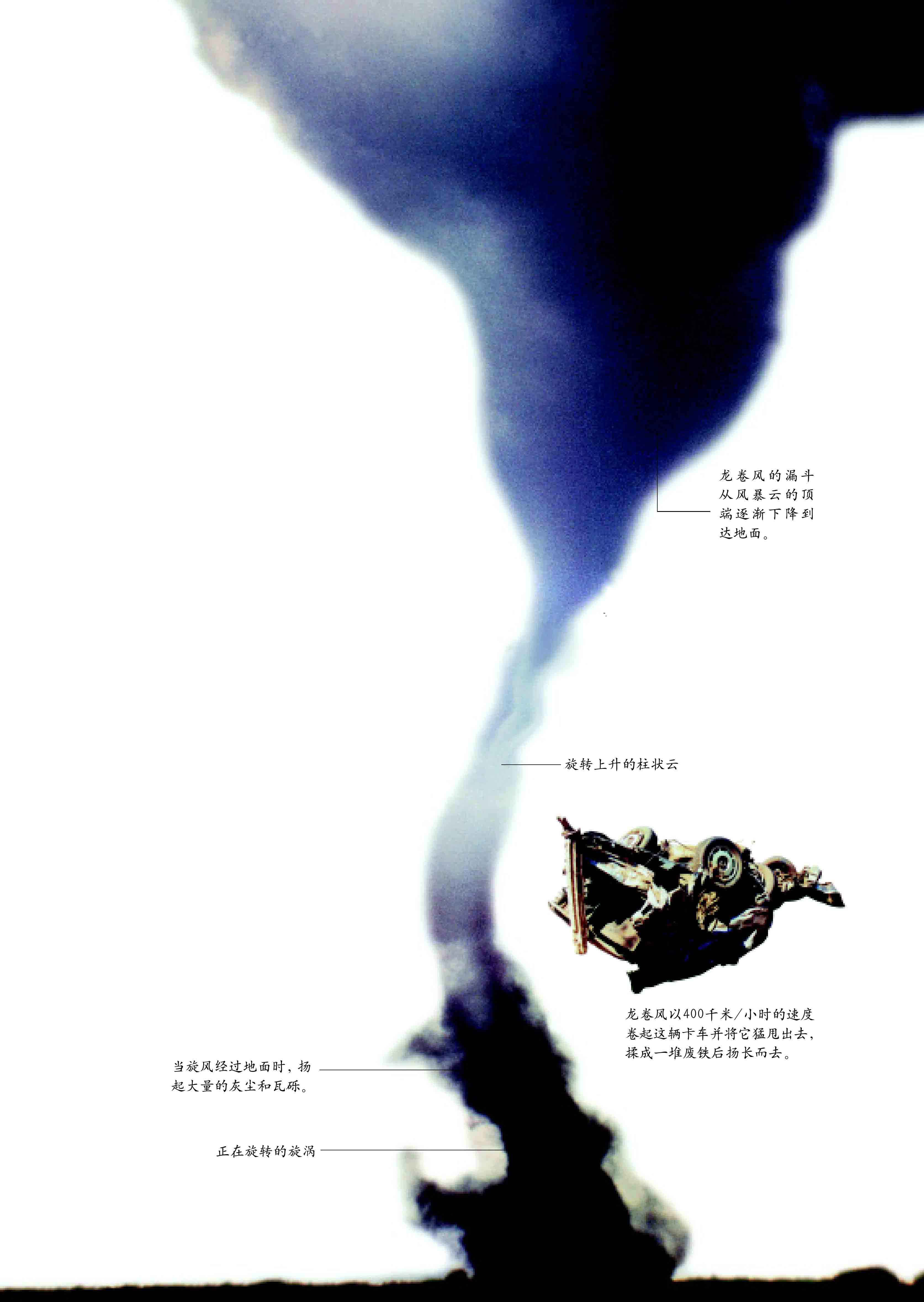 龙卷风的漏斗状空气旋转的时速可以达到500千米,这个毁灭性的旋涡通常有2千米宽,陆地表面的沙尘和物体被卷离地面后,或者抛在一边,或者随着旋涡旋转,直到风力停息,它们才落到数百千米以外的地面上。