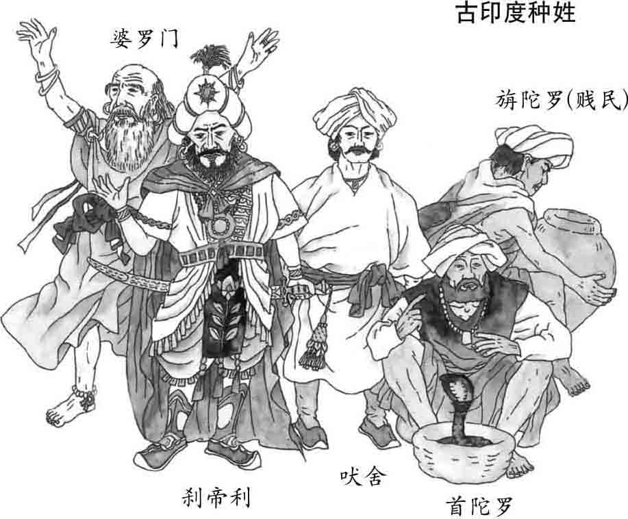 婆罗门种姓为祭司贵族,属于第一等级。掌握神权,传授圣书,地位最高。刹帝利种姓为军事贵族,或称武士阶级,包括国王和各级官吏,属于第二等级。刹帝利意为“权力”,把持国家的军事和行政大权。吠舍种姓为一般平民大众,包括农民、牧民、手工业者和商人等,属于第三等级。他们是没有任何特权的普通公民,必须按规定缴纳赋税。属于第四等级的首陀罗种姓,包括被征服的土著居民和雅利安人中的贫穷破产者,地位最低下。他们从事各种繁重、卑贱的劳动,其中许多人沦为雇工或奴隶。