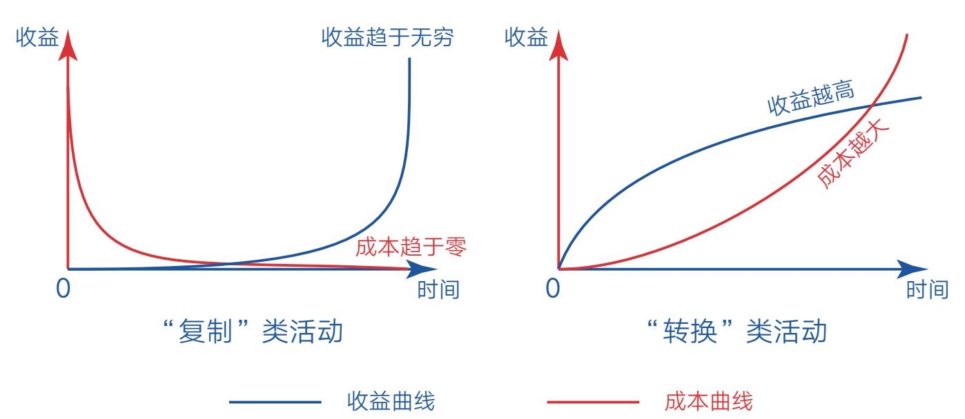 图1-2 “复制”类活动与“转换”类活动的边际成本和收益趋势