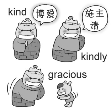 kind一般指发自内心的仁慈或天性仁慈;kindly则侧重举止和态度和蔼;gracious经常用来表示对地位低或年纪轻的人态度和蔼有礼貌。
