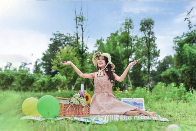 道具是配合人物表现的东西,其种类和玩法众多。在拍摄时要恰当地利用道具,切忌让道具成为多余的存在,如图2-56所示,人物坐在草地上进行野餐活动,此时可以人为地制造一些小泡泡漂浮于空中,并让人物与泡泡进行互动,拍摄出来的画面自然且不单调。